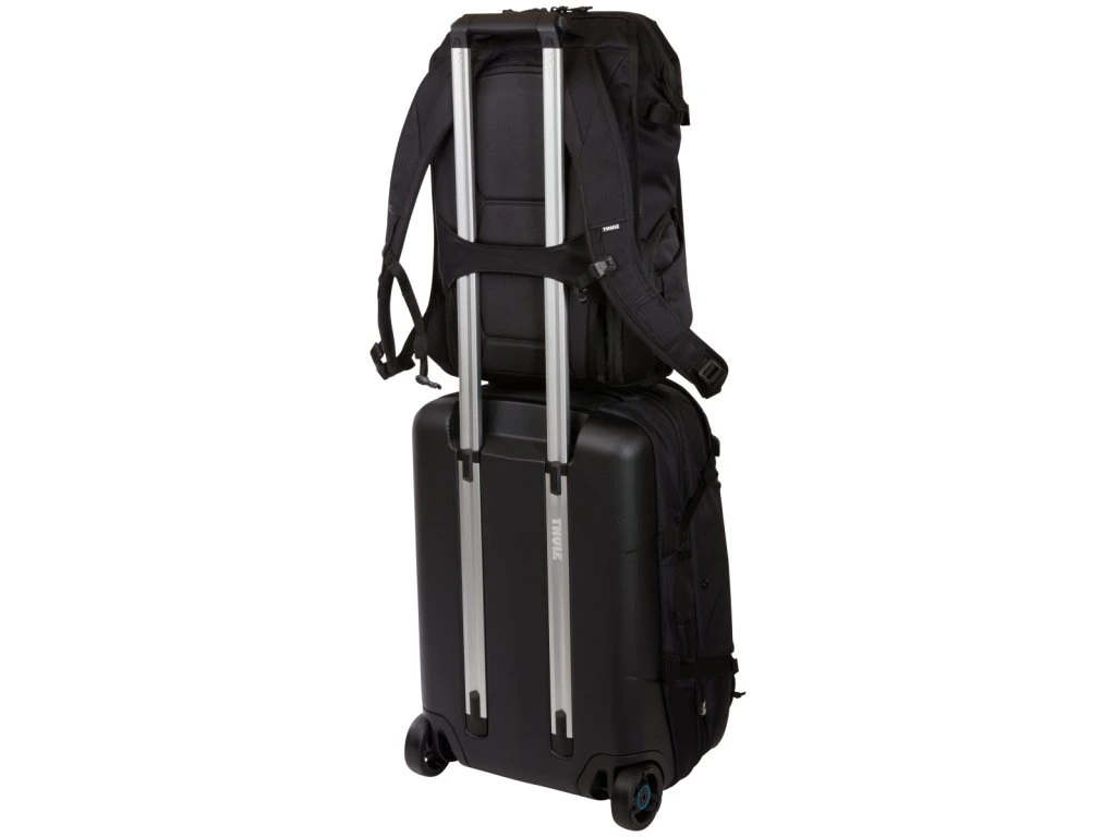 Zadný panel s popruhom, ktorý umožňuje batoh ľahko pripevniť k cestovnej batožine na kolieskach.