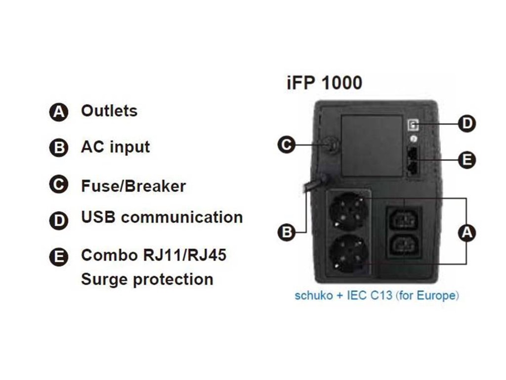 UPS zdroj slúži ako záložná batéria, ktorá udrží počítače, servery a inú IT techniku v chode pri výpadku elektrického prúdu. Hlavné vlastnosti: Dotykový display LCD Rad iFP je vybavený automatickou reguláciou napätia a tým znižuje dopad nestabilného napätia na zariadenie. Kompaktná veľkosť Vynikajúce mikroprocesorové riadenie zaručuje vysokú spoľahlivosť Stabilizácia napätia Automatické zapnutie pri obnove dodávky elektrickej energie automaticky sa nabíja po obnovení napájania Dobíjanie aj vo vypnutom režime Funkcia studeného štartu (bez pripojenia do elektrickej siete) Technická špecifikácia: Vstup: Kapacita: 1000 VA / 600 W Napätie: 220/220/2 140-290 V Frekvenčný rozsah: 60/50 Hz (automaticky) Výstup: Regulácia striedavého napätia (batériový mód): +/- 10% Frekvenčný rozsah (batériový mód): 60 Hz alebo 50 Hz +/- 1 Hz Prenosová doba: Typicky 2 - 6 ms Typ batérie a počet: 12V/7 Ah x 2 Typický čas dobíjania: 4 - 6 hodín pre 90% kapacity Ochrana: Kompletná ochrana: ochrana proti preťaženiu, vybitiu a prebíjaniu Výstrahy: Batériový mód: zvukový signál každých 10 sekúnd Nízky stav batérie: zvukový signál každú sekundu Preťaženie: zvukový signál každú vlastnosti: Typ výstupných zásuviek: 2 x Schuko zásuvka + IEC C13 Ochrana telefónnej linky RJ11 USB komunikačný port Rozmery (hĺbka x šírka x výška): 320 x 130 x 182 mm Hmotnosť: 8,2 Kg Prevádzkové prostredie: Vlhkosť: 0 - 90 % relatívna vlhkosť a 0 hluku: menej ako 40 dBDodatočné parametre