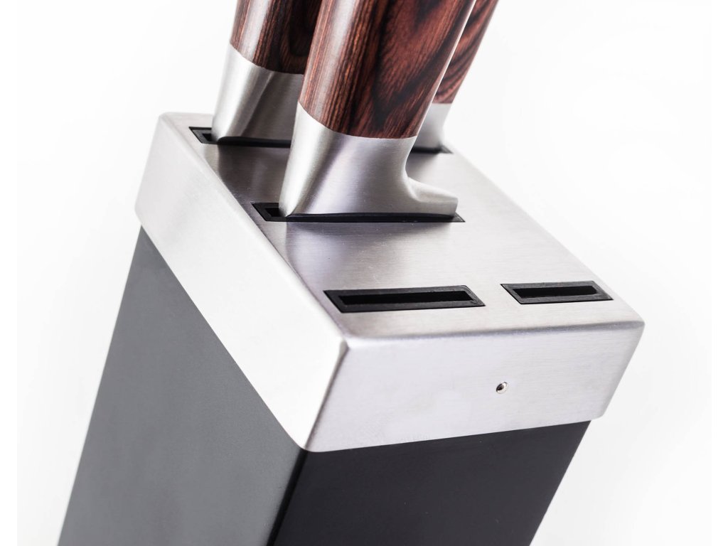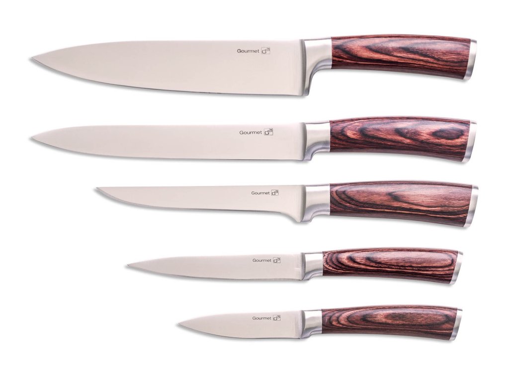 Nôž je jedným pri najpoužívanejších kuchynských nástrojoch. Hľadáte ideálnu sadu kuchynských nožov? Práve ste ju našli. Prezrite si dokonale ostré a praktické nože pre všetky situácie. Presvedčte sa. Súprava piatich vysoko kvalitných nožov G21 Gourmet Dynamic s vami bude krájať, vykosťovať, orezávať aj porciovať. Z bežného varenia vytvorí zábavu, ktorú ocení každý správny kuchár aj nenásytný stravník. Za kvalitu ručíme 4 roky Čepele nožov G21 Gourmet Dynamic sú vyrobené z kvalitnej ocele 5CR15, ktorá je využívaná napríklad aj na výrobu loveckých nožov. Vďaka použitému materiálu je čepeľ ostrá, odolná, pevná a bude vám slúžiť dlhé roky. Rukoväte sú vyrobené z extra pevného, odolného materiálu nazývaného Pakka wood, pri výrobe ktorého je dyha z tvrdého dreva napustená teplom tvrdenou živicou. Výsledkom sú pevné rukoväte, ktoré nepodliehajú skaze času. Hladké, rovné, čisté línie týchto nožov sa stanú ozdobou každej kuchyne. V stojane av bezpečí Neviete kam nože bezpečne uložiť? Do stojanu! Súčasťou sady je dizajnový stojan v čierno-striebornom prevedení. V stojane má každý z nožov svoje bezpečné miesto. Predĺžená záruka 2 + 2 roky Za kvalitu tohto produktu ručíme 4 roky. K štandardnej záručnej lehote 2 roky získate registráciou na webe https://www.g21-vitality.cz/registracezaruky predĺženie záruky o ďalšie 2 roky. Využite túto možnosť a po kúpe si zaregistrujte. Predĺžená záruka 2 + 2 roky sa oplatí! Parametre: Materiál: oceľ 5CR15 Materiál rukovätí: Pakka wood v hnedej farbe Materiál stojančeka: kov Predĺžená záruka 2 + 2 roky Výška stojana s nožmi: 33 cm Šírka stojana: 8,5 cm Rozmery balenia: 18,5 x 36,5 x 10 cm 21 cm Krájací nôž 21 cm Vykosťovací nôž 15,5 cm Univerzálny nôž 13 cm Krájací nôž 9 cm Stojan Certifikácia: LFGBDodatočné parametre
