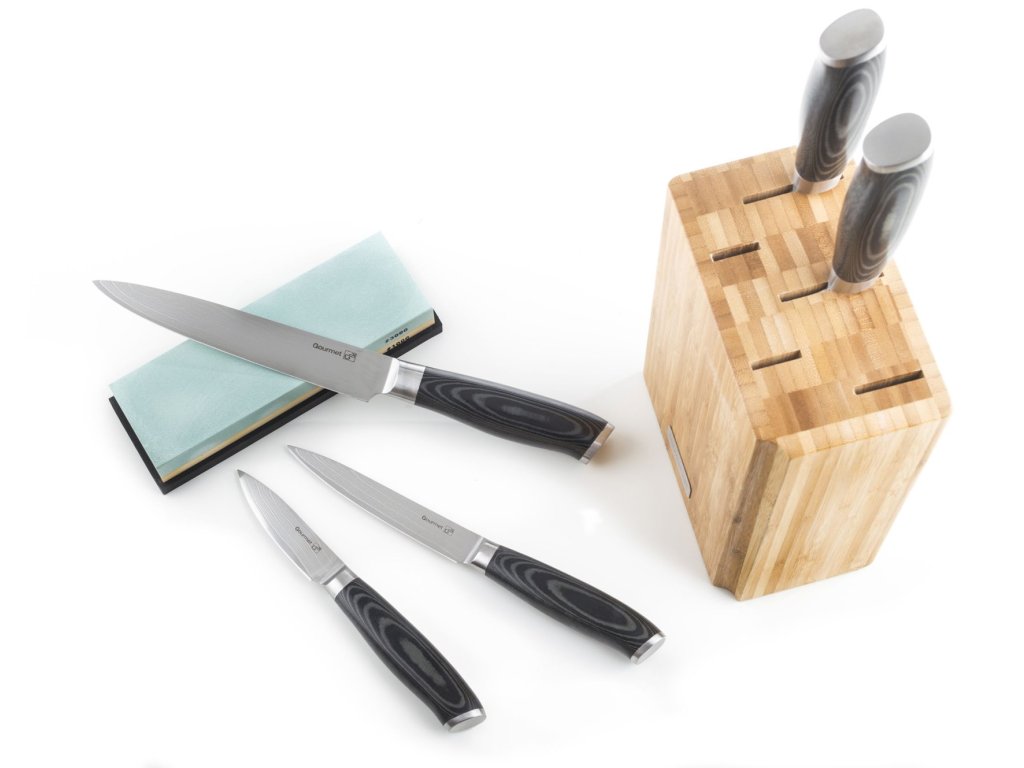 G21 Sada damaškových nožov Gourmet v bambusovom bloku 5 ks brúsnych kameňov