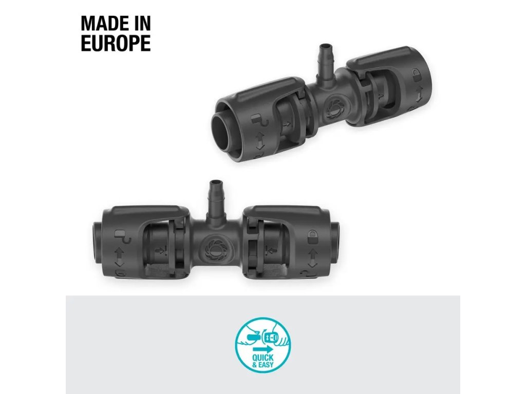 T-spojka 1/2" - 3/16" od spoločnosti GARDENA je vhodná na výmenu 13 mm pripojovacej rúrky za 4,6 mm prívodnú rúrku systému Micro-Drip. Päť priložených T-spojok má dva vstupy a výstupy pre pripojovacie potrubie a jeden vstup a výstup pre prívodné potrubie. Spojka je veľmi užitočná na odbočenie z hlavného potrubia do jednotlivých kvetináčov, žľabov alebo záhonov. Micro-Drip-System sa vďaka patentovanej technológii pripojenia ľahko inštaluje a je flexibilne rozšíriteľný. V zavretej polohe poskytuje spätná väzba kliknutím a zvukovým signálom spoľahlivý pocit počas inštalácie. Technológia pripojenia Quick & Easy umožňuje jednoduché pripojenie, flexibilné rozšírenie a jednoduché odpojenie všetkých komponentov. Vďaka tomu sú komponenty opakovane použiteľné a udržateľné. Micro-Drip-System je spoľahlivý vodotesný s rovnomerným tlakom vody v kombinácii so samostatne dostupnou hlavnou jednotkou 1000 (č. výr. 13333-20) alebo hlavnou jednotkou 2000 (č. výr. 13310-20). Okrem toho je T-kus 1/2" - 3/16" kvalitným výrobkom spoločnosti GARDENA vyrobeným v Európe.Dodatočné parametre