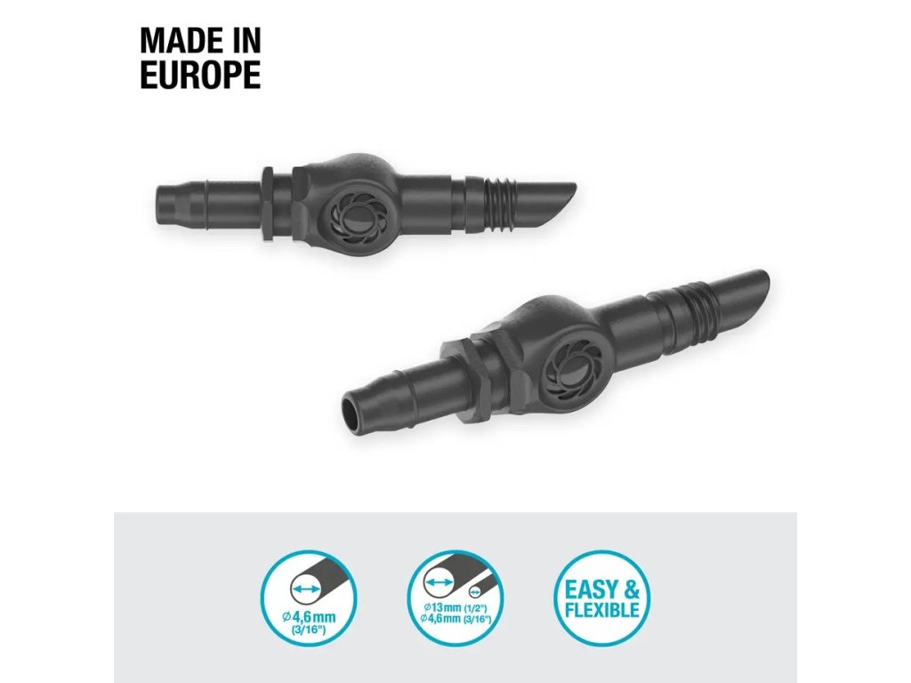 Na jednoduché pripojenie dvoch 4,6 mm prívodných rúrok alebo na predĺženie rúrok použite 4,6 mm (3/16") prípojku GARDENA Micro-Drip-System. Praktická spojka slúži aj ako prechod z pripojenej 13 mm spojovacej rúrky na 4,6 mm prívodnú rúrku. Instalácia je pohodlná a jednoduchá. komponenty systému Micro-Drip-System môžete bez problémov používať viackrát jednoduchým pripojením, flexibilným predĺžením a jednoduchým odpojením vďaka technológii pripojenia Easy & Flexible. 2000 (č. výr. 13310-20). Praktická prípojka GARDENA 4,6 mm (3/16") sa vyrába v Európe. Micro-Drip-System. Starostlivosť o vaše rastliny a každú vzácnu kvapku. Jednoduché a presné zavlažovanie, úspora vody a času.Dodatočné parametre