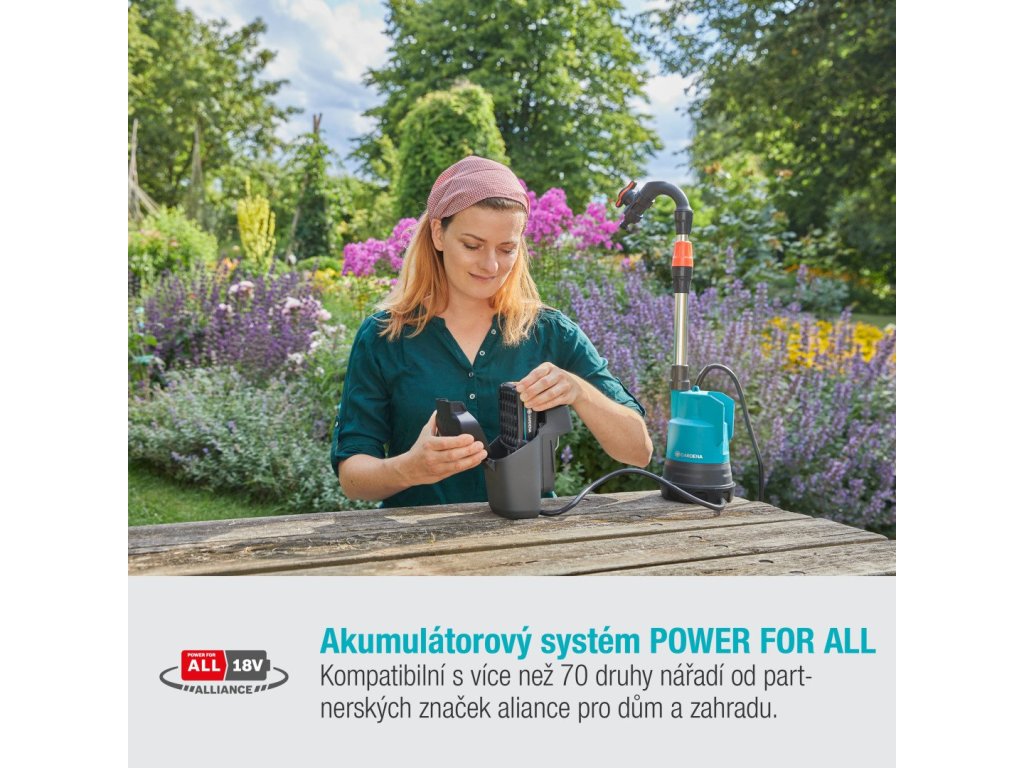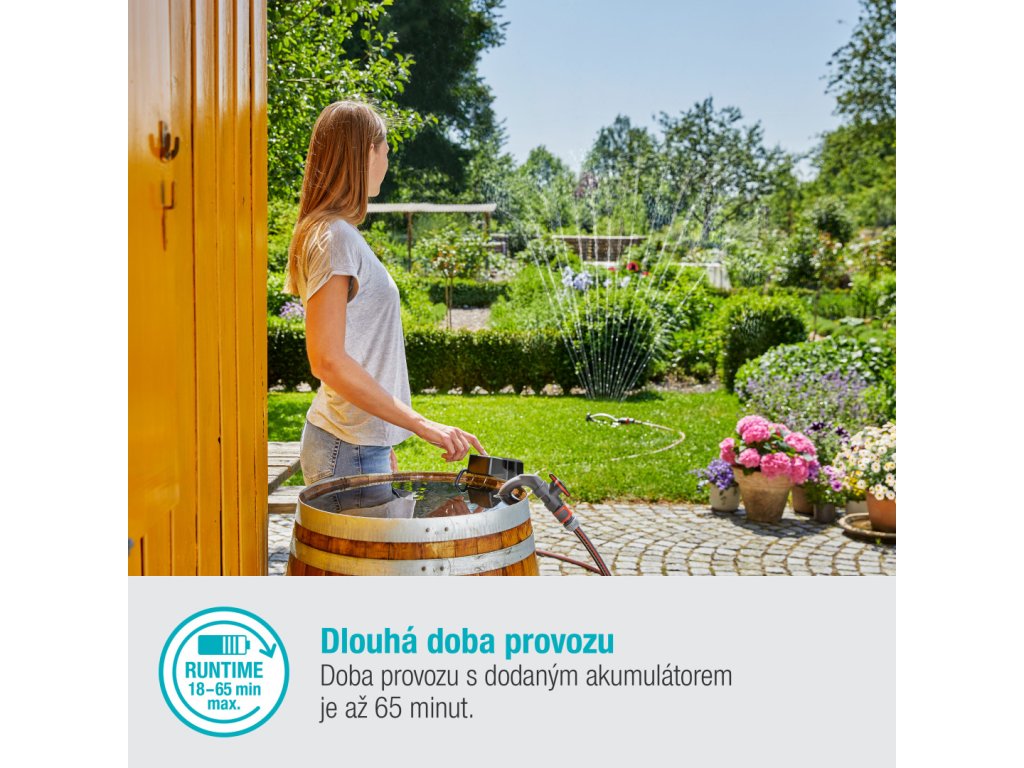 Flexibilné a výkonné - bateriové čerpadlo na dešťovú vodu Zavlažovanie záhrady mäkkou dešťovou vodou nielen šetrí peniaze, ale je aj najlepšou možnou voľbou pre rastliny a životné prostredie. Ale kto má neustále so sebou vláčiť kanvy na polievanie? Vy nemusíte! S GARDENA akumulátorovým čerpadlom do suda 2000/2 18V P4A nepotrebujete na zavlažovanie žiadnu energiu ani čas, pretože čerpá vodu priamo zo suda - dokonca aj na miestach bez elektrickej prípojky. Ak čerpadlo skombinujete so zavlažovačom, zavlažovacou sprchou alebo zavlažovačom od spoločnosti GARDENA, ako je napríklad štvorcový zavlažovač AquaZoom, vaše kríky, kvety a trávnik dostanú presne takú jemnú sprchu, aká sa im hodí. Hliníkové teleskopické potrubie čerpadla možno nastaviť podľa výšky suda na dešťovú vodu. Sudové čerpadlo prečerpá až 2 000 litrov za hodinu a vytvorí maximálny tlak 2,0 bar. Pomocou regulačného ventilu možno prietok vody cez čerpadlo regulovať podľa potreby - možné je aj kvapkové zavlažovanie. Časovač umožňuje zvoliť, ako dlho má čerpadlo pracovať. Potom sa čerpadlo automaticky vypne. A čo ak je sud už prázdny? Žiadny problém: funkcia chodu nasucho chráni čerpadlo pred poškodením. Integrovaný je aj predfilter na zachytávanie nečistot. Dá sa jednoducho vybrať a vyčistiť. Teleso čerpadla je pevné a odolné, rovnako ako všetky ostatné komponenty sudového čerpadla. Preto pri registrácii nákupu online ponúkame päťročnú záruku. Záhradné čerpadlo môžete samozrejme používať nielen v sudoch na dešťovú vodu, ale aj na všetky ostatné úlohy spojené s čerpáním. Akumulátorové čerpadlo na dešťovú vodu 2000/2 od spoločnosti GARDENA sa dodáva ako súprava pripravená na použitie s nabíjačkou a 18 V akumulátorom POWER FOR ALL s dobou chodu 18 až 65 minút - v závislosti od zvoleného režimu. Aliancia POWER FOR ALL je jednou z najväčších aliancií popredných svetových výrobcov akumulátorov rôznych značiek. Akumulátor je kompatibilný s celou radou ďalších domových a záhradných zariadení – to znamená, že nebudete potrebovať ďalší akumulátor pre každé zariadenie. Ušetríte tak peniaze a získate trvalú flexibilitu! Nadšenie poháňané značkou GARDENA - záhradné akumulátorové vybavenie, ktoré vám dáva slobodu pri práci. Špecifikácia Maximálna kapacita vybíjania 2000 l/h Maximálny tlak 2 bar Maximálna hĺbka ponorenia 1,8 m Maximálna výška vypúšťania 20 m Maximálna teplota čerpania 35 °C Dĺžka kábla 2 mDodatočné parametre