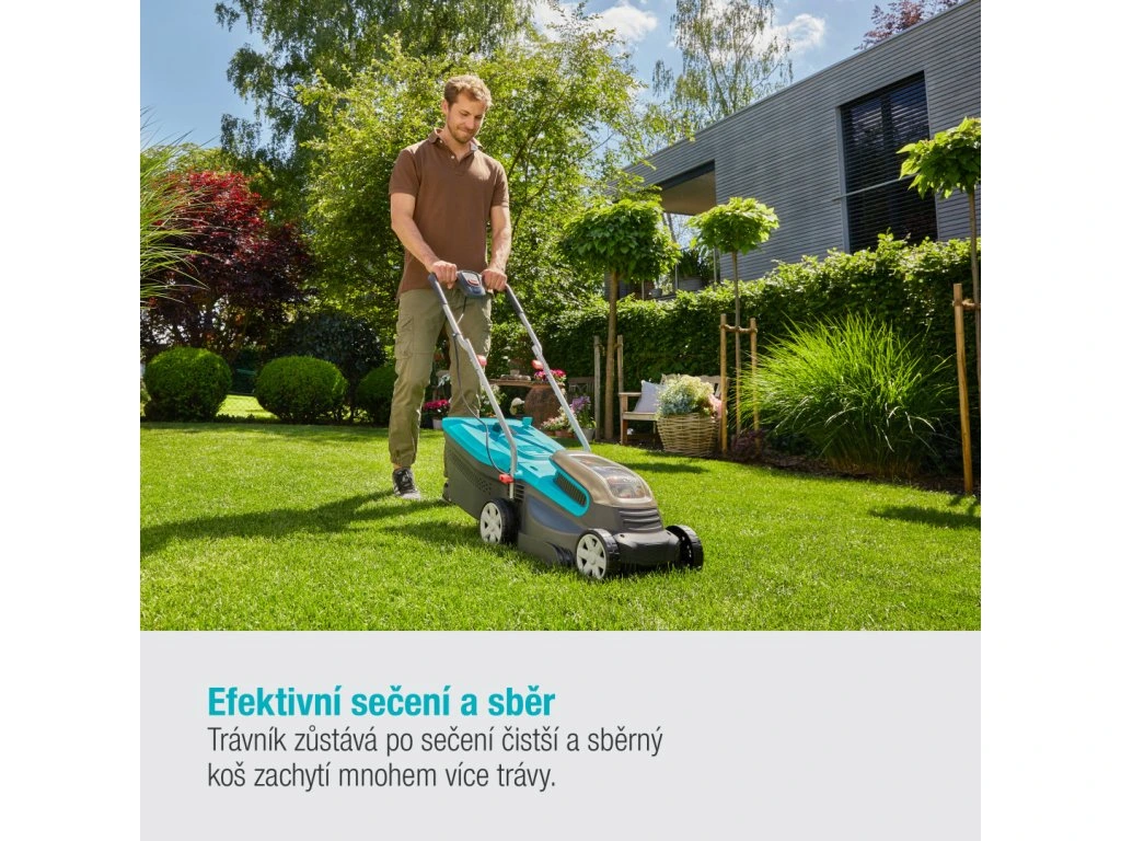 Špeciálne tvrdený nôž zaručuje vynikajúce výsledky kosenia. Pracovná šírka je 32 cm. Výšku kosenia možno jednoducho nastaviť na desať rôznych úrovní pomocou funkcie QuickFit - stačí stlačiť a otočiť. Trávnikové hrebene na stranách krytu zabezpečujú kosenie trávy pri stenách a obrubníkoch, takže vám nikdy nezostanú nevzhľadné chumáče trávy.