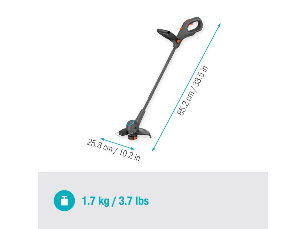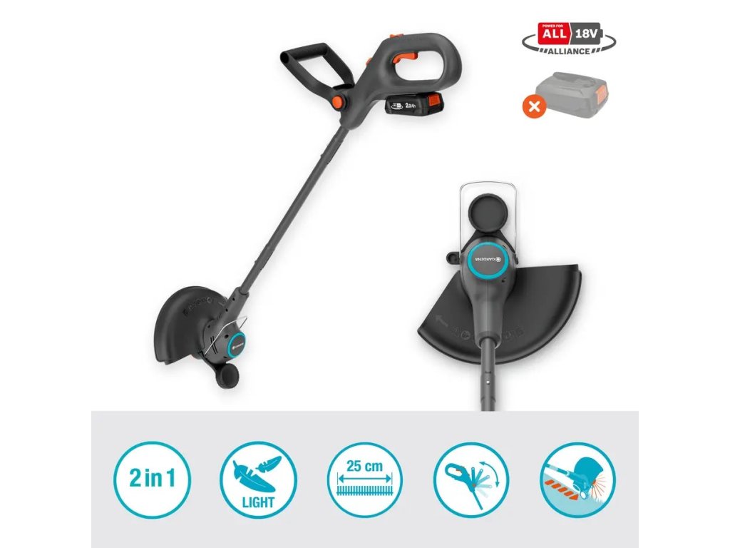 Jednoduché prenášanie, držanie a preprava s hmotnosťou ľan 2,1 kg Funkcia 2v1. Rýchle prepínanie medzi režimom zastrihávania a lemovania trávnika Koliesko na úpravu okrajov poskytuje dodatočnú stabilitu pre rovné línie a čistý a upravený povrch Nastaviteľná rukoväť na pohodlné zastrihávanie Obsah: 1x GARDENA EasyTrim 25 solo EasyTrim 25 18V 2 v 1. Tento vyžínač využíva 18V akumulátor POWER FOR ALL (predáva sa samostatne) a váži len 1,7 kg (2,1 kg s akumulátorom). Tento ručný vyžínač sa môže pochváliť veľkou reznou kapacitou s pracovným priemerom 25 cm a strunou s tloušťkou 1,6 mm s automatickým posuvom. Rýchla a jednoduchá preprava Ľahký a ľahko ovládateľný akumulátorový nástroj, ktorý sa dá ľahko a pohodlne prenášať aj vo veľkých záhradách. Napriek nízkej hmotnosti má dostatočný výkon na zastrihávanie trávnikov všetkých tvarov a veľkostí a nastaviteľný ochranný kryt rastlín zabezpečí bezpečnosť vašich kvetov, stromov a kríkov. 2v1 - jednoduché prepínanie medzi zastrihávaním a lemovaním trávnika Vďaka vyžínaču EasyTrim je starostlivosť o vašu záhradu rýchla a jednoduchá. Stlačením tlačidla a otočením sa prepne z režimu zastrihávania na režim lemovania. Jeho rukoväť s dlhým dosahom umožňuje ľahký prístup do zákutí a rohov a jeho nízka hmotnosť zabraňuje namáhavej práci. A vďaka automatickému podávaniu struny ovládanému spúšťačom už nikdy nebude vaše zastrihávanie prerušené pretrhnutou strunou. Hranové kolečko pre rovné okraje Skvelý strih môžu narušiť nerovné okraje. Systém EasyTrim je vybavený okrajovým koleskom, ktoré sa valí po zemi a zabezpečuje čisté a rovné okraje. Okrajové kolečko sa môže kotúľať aj podél plotov a stien, aby pomohlo chrániť strunu pred pretrhnutím. Ergonomický dizajn Rozlúčte sa s bolesťou, ktorá pomerne často prichádza pri zastrihávaní záhrady. Systém EasyTrim je nielen ľahký a ľahko sa s ním manipuluje. Môže sa pochváliť aj ergonomickým dizajnom pre optimálne pohodlie a ovládanie. Nastaviteľná rukoväť maximalizuje pohodlie a znižuje namáhanie zápästia. Súčasť aliancie POWER FOR ALL Akumulátorový zastrihávač EasyTrim je napájaný 18V akumulátorom P4A. Aliancia POWER FOR ALL je jednou z najväčších aliancií popredných výrobcov akumulátorov 11 značiek a pre viac ako 100 aplikácií. Akumulátor je kompatibilný s mnohými ďalšími zariadeniami v domácnosti a záhrade – to znamená, že už nemusíte kupovať nový akumulátor pre každý výrobok. Ušetríte tak peniaze a zachováte si flexibilitu za každých okolností! Batérie POWER FOR ALL a nabíjačka sa predávajú samostatne. GARDENA poskytuje 3-ročnú záruku po registrácii na stránke gardena.com/registration do 3 mesiacov od nákupu. Na batérie a nabíjačky (ak sa predávajú spolu s výrobkom) sa záruka nevzťahuje. Záručné podmienky nájdete na stránke gardena.com/warranty.Dodatočné parametre
