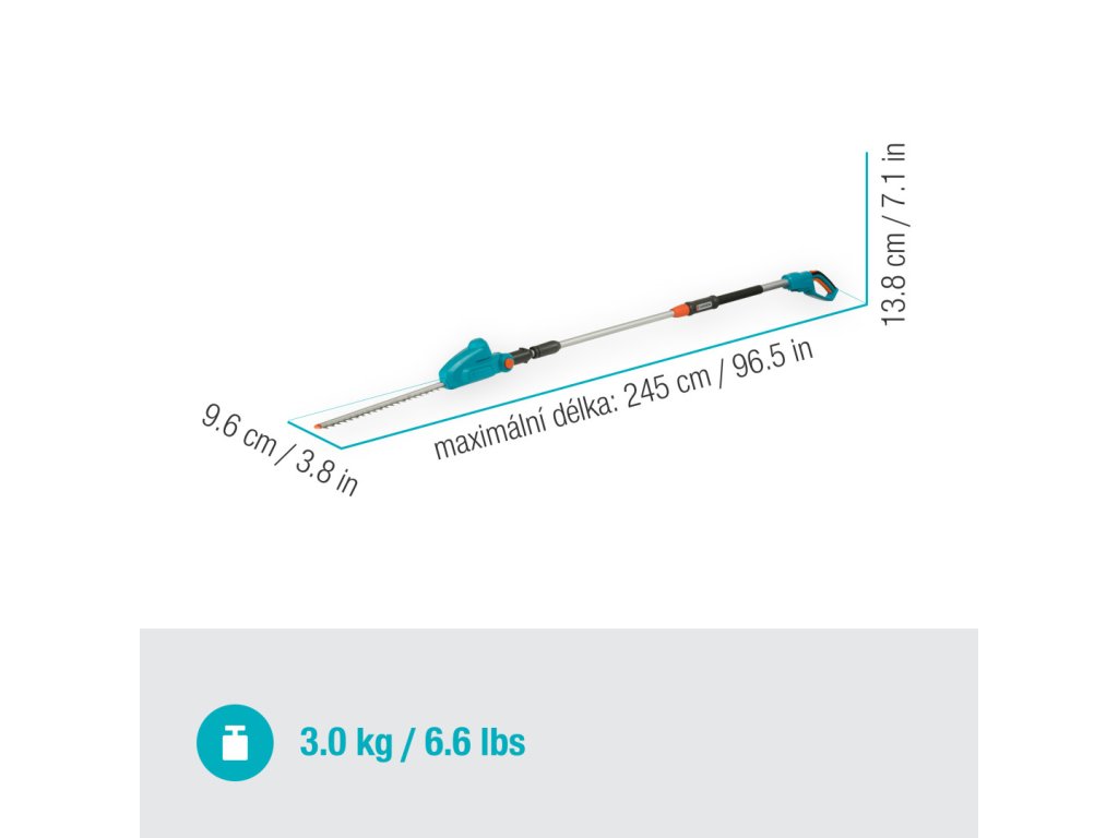 Akumulátorové nožnice na živý plot s teleskopickou rukoväťou pre vysoké živé ploty Vysoké živé ploty chránia súkromie. Problém však nastáva pri strihaní - čoskoro si budete priať, aby súkromie nebolo takou prioritou, pretože by vám to výrazne uľahčilo prácu. Pokiaľ nepoužijete GARDENA teleskopické nožnice na živý plot THS 42/18V P4A. Hravo si poradia s živými plotmi s výškou 3 m. Strihanie z vratkého rebríka je minulosťou, celý čas stojíte oboma nohami bezpečne na pevnej zemi a nemusíte sa obávať napájacích káblov. Vďaka LED indikátoru priamo na rukoväti ste vždy informovaní o aktuálnom stave nabitia. V závislosti od použitej batérie môže výrobok dosiahnuť čas prevádzky až 240 minút a zastrihnúť až 600 metrov štvorcových živého plotu. Teleskopické nožnice vážia bez batérie 3,0 kg; ich rukoväť je ergonomicky navrhnutá a má ideálne ťažisko. To znamená, že vám pohodlne a bezpečne padnú do ruky, aj keď je teleskopická rukoväť úplne vysunutá, takže môžete využiť celý trojmetrový dosah. Potrebujete zastrihnúť hornú časť živého plotu? Ani to nie je problém: hlavu zastrihávača možno nakloniť - funkcia, ktorá je veľmi pohodlná aj pri strihaní pôdopokryvných rastlín. Už sa nemusíte ohýbať a odľahčíte si aj kolená. Bez námahy strihá konáre a výhonky hrubé až 16 milimetrov; optimalizovaná geometria nožov zabezpečuje efektívny a čistý rez. Vďaka čepeli s dĺžkou 42 centimetrov môžete rýchlo zastrihnúť celú šírku živého plotu. Na účely prepravy alebo skladovania môžete teleskopické nožnice na živý plot jednoducho rozdeliť na dve časti bez použitia náradia. GARDENA akumulátorové teleskopické nožnice na živý plot THS 42/18V P4A bez akumulátora sa dodávajú bez akumulátora a nabíjačky. Na prevádzku môžete použiť akýkoľvek 18 V systémový akumulátor z aliancie POWER FOR ALL. Tieto akumulátory sú vhodné pre celý rad domácich a záhradných zariadení. Takže ušetríte peniaze a zostanete flexibilní! Alebo dávate prednosť kúpe výrobku so systémovou batériou? Ani to nie je problém - potom je tu pre vás tá správna súprava, ktorú môžete ihneď používať. Nadšenie poháňané značkou GARDENA - záhradné akumulátorové vybavenie, ktoré vám dáva slobodu pri práci. Štandardné vybavenie Rozstup nožov (zubov) 16 mm Údaje o vibráciách a hlučnosti Hladina akustického výkonu, garantovaná (LWA), db(A) 90 dB(A) Hladina akustického tlaku pri uchu obsluhy, db(A) 72 dB(A) Hodnota emisie vibrácií (ah), max. 1 m/s2Dodatočné parametre