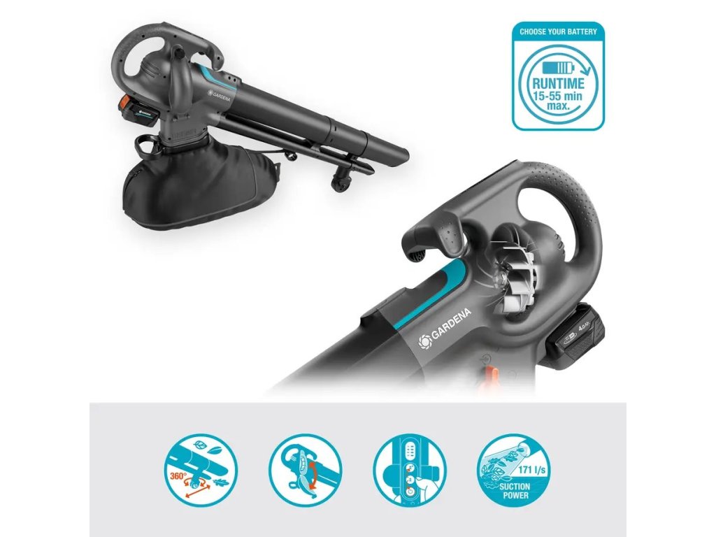 Bezproblémové čistenie záhrady: GARDENA akumulátorový záhradný vysávač/fukár PowerJet - bez batérie na účinné odstraňovanie listia Bez námahy odstráňte listy a nečistoty zo svojej záhrady pomocou GARDENA akumulátorového vysávača/fukára PowerJet Collect. Tento bezdrôtový multifunkčný stroj sa ľahko používa, je ergonomický a poháňaný 18 V akumulátorom P4A (je súčasťou balenia) pre bezkonkurenčný čistiaci výkon a pohodlie. Silný výkon, prvotriedne sanie Ľahký a kompaktný vysávač/fukár PowerJet Collect poskytuje skutočný výkon. Výkonný bezkefový motor poskytuje pôsobivý prietok vzduchu s nastaviteľným sacím výkonom na rýchle odstraňovanie lístia. Vysokokvalitný mulčovací nôž rozdrví listy na lepšie uskladnenie a efektívne kompostovanie s menšou pravdepodobnosťou vzniku pliesní. Prémiové kovové obežné koleso poskytuje robustnú odolnosť a spoľahlivý výkon. Koleso sa otáča vo všetkých smeroch Koliesko otočné o 360 stupňov s nastavením výšky uľahčuje prácu na rôznych površích a znižuje námahu. Ideálny pre väčšie záhrady, žľaby, odtoky alebo všade tam, kde môže padať listy a odpad. Jednoduché používanie s ovládaním jedným dotykom Záhradný vysávač/fúkač PowerJet Collect, navrhnutý pre pohodlí, je vybavený ramenným popruhom na jednoduché prenášanie, pričom ovládanie jednou rukou bez spúšte znižuje námahu užívateľa. Prepínanie medzi funkciami vysávania a fúkania je jednoduché a rýchlosť sania sa ovláda pomocou intuitívnych ovládacích prvkov. Bez námahy môžete aktivovať aj režim PowerBoost na náročné úlohy, ako je napríklad zaseknuté mokré listy. Jednoduchý prístup na jednoduchú údržbu Bočná servisná klapka umožňuje jednoduchý prístup ku kvalitnému kovovému obežnému kolesu a odstránenie upchatia v priebehu niekoľkých sekúnd. Robustná sběrná kapsa s dvojitou výstelkou je odolná voči vlhkosti a je navrhnutá na jednoduché odpojenie a vyprázdnenie. Už žiadne sklamanie a neriadok spôsobené ťažko upevniteľnými jednovrstvovými kapsami. Súčasť aliancie POWER FOR ALL Ako súčasť aliancie POWER FOR ALL, jednej z najväčších aliancií popredných výrobcov baterií rôznych značiek, používa rovnakú bateriu 11 ďalších značiek pre viac ako 100 aplikácií. Batéria je preto kompatibilná s mnohými ďalšími nástrojmi v domácnosti a záhrade – to znamená, že už nemusíte kupovať novú bateriu pre každý výrobok. Ušetríte peniaze a zostanete vždy flexibilní! GARDENA poskytuje 3-ročnú záruku po registrácii na stránke gardena.com/registration do 3 mesiacov od nákupu. Záruka sa nevzťahuje na batérie a nabíjačky (ak sa predávajú spolu s výrobkom). Záručné podmienky nájdete na stránke gardena.com/warranty.Dodatočné parametre