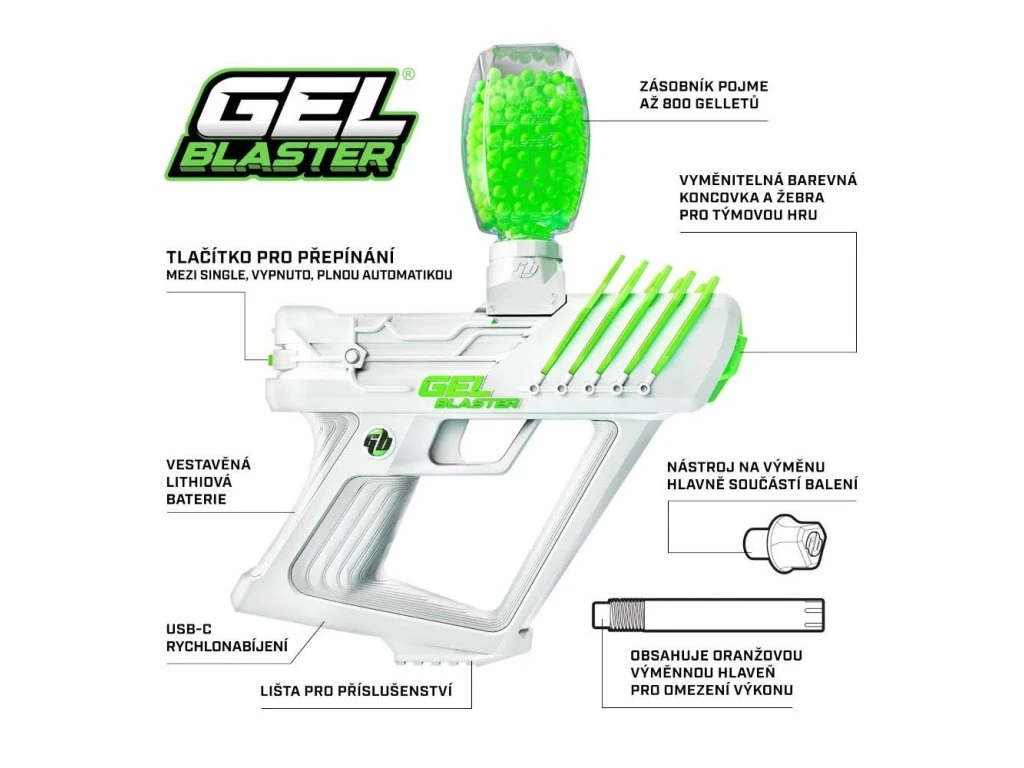 2 režimy streľby - jednoduchý a plná automatika (10 výstrelov/sek.), plný zásobník "pripravený na odstrel" s kapacitou 800 gélov + 10 000 gélov v balení, ekologické náboje na báze vody, vstavaná batéria s výdržou až 4 hodiny, dosah 30 metrov, materiál plast, biela a zelená farba, vhodné od 14 rokovGel Blaster Surge: Okamžitá zábava - rozbaľte a hrajte sa!