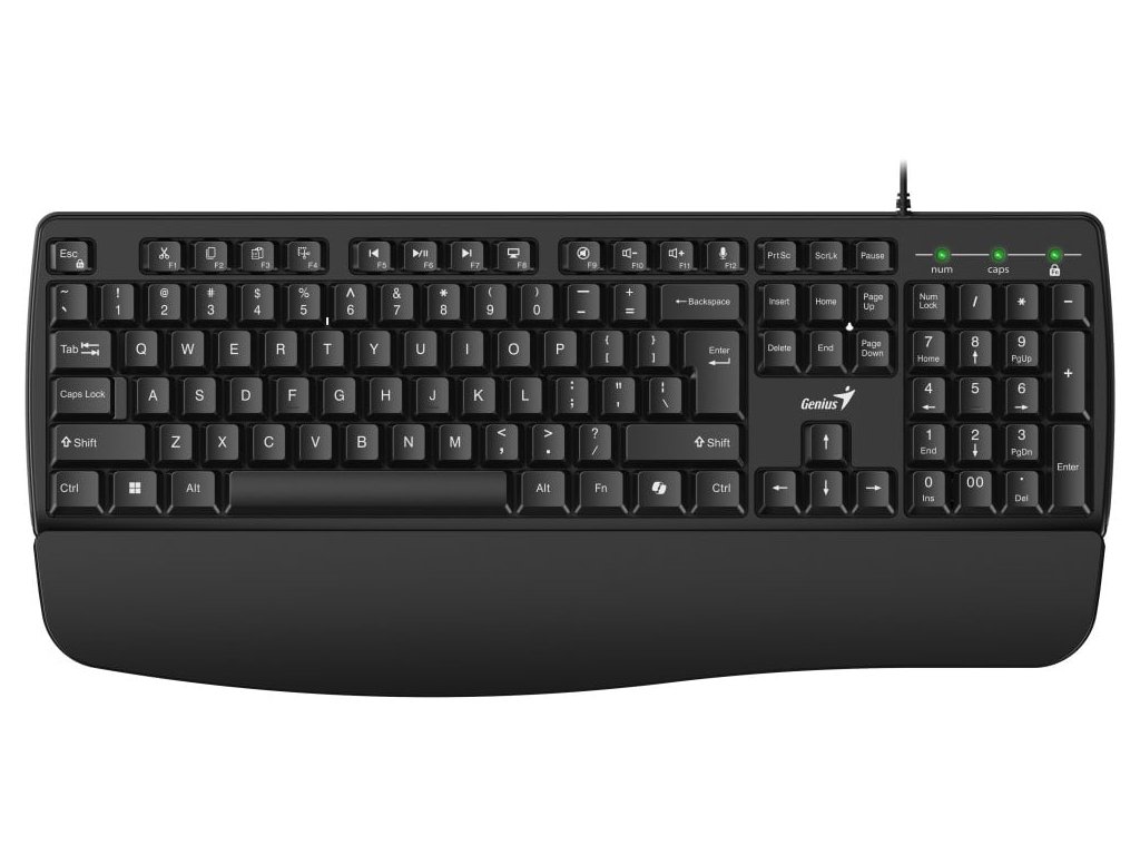 Klávesnice Genius KB-123 – pro psaní a práci na PC Drátová klávesnice Genius KB-123 s integrovanou opěrkou pro zápěstí je vhodná pro každodenní psaní a efektivní používání u pracovního nebo domácího PC. Je tak vhodná do kanceláře, na home office, nebo třeba školní učebny. Její ergonomii, jednoduchost a praktičnost ocení všichni běžní uživatelé. Klávesnice Genius KB-123 obsahuje také numerický blok pro jednoduché zadávání čísel a dalších znaků. Nechybí ani multimediální klávesy pro ovládání přehrávání a hlasitosti. klávesnice Genius KB-123 Mezi další přednosti patří integrovaná opěrka zápěstí, která zvyšuje pohodlí při psaní delších textů a častém používání. Potěší také přítomnost samostatné klávesy Copilot, která spustí chytrý pracovní nástroj Microsoft Copilot, s jehož pomocí snadno zvládnete každodenní firemní administrativu, e-mailovou komunikaci, informační rešerše apod. Připojení přes USB s funkcí Plug and Play vám umožní klávesnici Genius KB-123 okamžitě uvést do provozu a začít psát. klávesnice Genius KB-123 Genius KB-123 Drátová klávesnice s opěrkou zápěstí a dedikovanou klávesou pro AI asistenta Copilot. Genius KB-123 je kancelářská klávesnice s ergonomickou opěrkou zápěstí, která podporuje předloktí a snižuje namáhání zápěstí pro pohodlnější a zdravější psaní. Tento model je vybaven speciální klávesou pro aktivaci AI asistenta Copilot (pro Windows 11 a novější) a nabízí řadu praktických zkratkových kláves pro zvýšení produktivity. Klávesnice disponuje odolností proti polití, což zajišťuje její spolehlivost i v případě drobných nehod. Díky plnohodnotnému rozložení včetně numerické části a speciální klávesy 00 je ideální pro efektivní práci s dokumenty a tabulkami. Plnohodnotná drátová klávesnice s klávesou pro aktivaci AI asistenta Copilot Ergonomická opěrka zápěstí pro pohodlné psaní a snížení únavy Zkratkové klávesy pro editaci Office dokumentů Multimediální klávesy pro ovládání přehrávání a hlasitosti Speciální klávesa 00 pro rychlejší práci s čísly Odolnost proti polití pro zvýšenou spolehlivost Přepínač FN Lock pro snadnou volbu mezi funkcemi kláves Dedikovaná klávesa pro mikrofon Připojení přes USB s funkcí Plug and Play Praktické zkratkové klávesy Klávesnice nabízí speciální sekci s často používanými zkratkami pro editaci dokumentů (Vyjmout, Kopírovat, Vložit, SniPaste), ovládání AI asistenta Copilot a přehrávání médií včetně přepínání skladeb a nastavení hlasitosti. Ergonomický design Součástí balení je odnímatelná opěrka zápěstí, která poskytuje oporu předloktím a prstům pro pohodlnější psaní. Konkávní tvar kláves zajišťuje přirozené umístění prstů a přesnější psaní. Odolnost a spolehlivost Klávesnice je navržena s ochranou proti polití, což pomáhá předcházet poškození při drobných nehodách. Robustní konstrukce a kvalitní zpracování zajišťují dlouhou životnost při každodenním používání. ZÁKLADNÍ SPECIFIKACE Typ: drátová klávesnice s opěrkou zápěstí Rozhraní: USB Typ kláves: konkávní Rozložení kláves: československé Délka kabelu: 1,5 m Hmotnost: 511 g Rozměry: 444,6 × 197,8 × 26,7 mm Barva: černá Speciální funkce: klávesa Copilot, zkratkové klávesy pro Office, multimediální klávesy, odolnost proti polití Systémové požadavky: Windows 8/10/11 nebo novější, Mac OS X 10.8 nebo novější, volný USB port Obsah balení: klávesnice KB-123, opěrka zápěstí, vícejazyčný rychlý průvodceDodatočné parametre