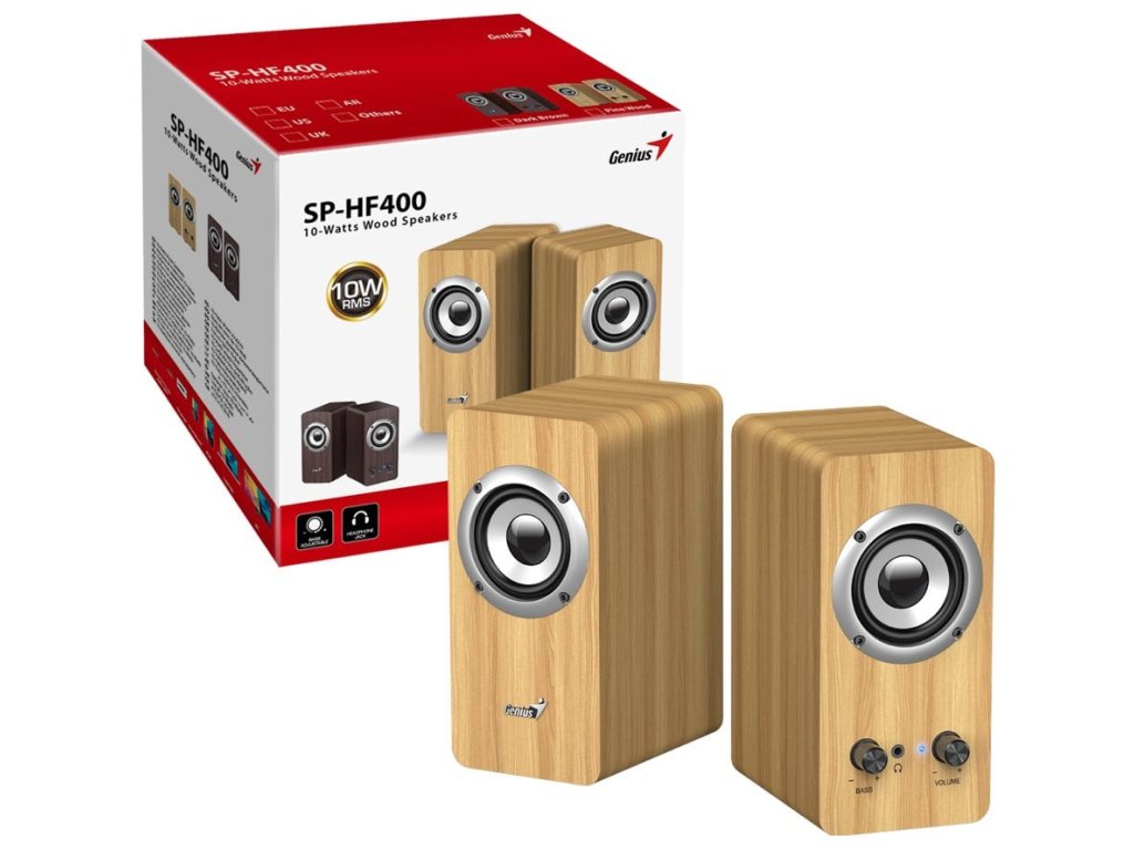 Genius SP-HF400 - partner, ktorý nezavrie ústaReproduktory Genius SP-HF400 sú elegantné na pohľad, a keď ich zapnete, nakopnú vás. Majú výkon 10 W RMS a sú vhodné na počúvanie hudby, sledovanie filmov a iné multimediálne ozvučenie. Drevená konštrukcia robí z reproduktorov štýlový doplnok k počítaču alebo notebooku a poteší všetkých priaznivcov čistej elegancie bez rušivých svetiel a lesku okolo. Napriek kompaktným rozmerom reproduktory Genius SP-HF400 produkujú čistý a silný zvuk s údernými basmi, ktoré potešia aj tie najnáročnejšie uši. Drevená konštrukcia podporuje čistú reprodukciu bez skreslenia, dunenia a iných vplyvov, ktoré znižujú kvalitu počúvania.