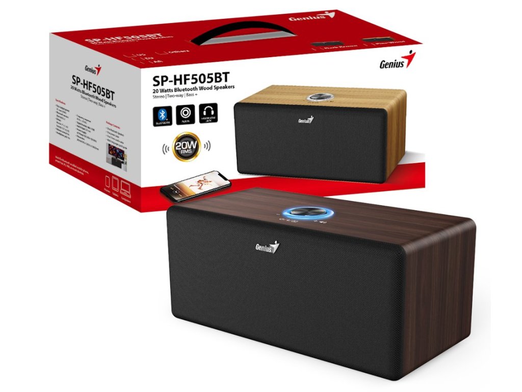 Genius SP-HF505BT - Bluetooth reproduktor, ktorý má štýl a výkon Reproduktor Genius SP-HF505BT sa stane ideálnym základom vášho domáceho zvukového systému. Je ideálny na počúvanie hudby, sledovanie filmov, videí alebo hranie hier. Vďaka drevenej konštrukcii je elegantný na pohľad a produkuje prirodzený zvuk bez skreslenia, ktorý poskytuje celkový výkon 20 W RMS. Bezdrôtové pripojenie prostredníctvom technológie Bluetooth umožňuje pohodlné bezdrôtové pripojenie k smartfónu, tabletu alebo notebooku. Samozrejmosťou je aj prítomnosť vstupu AUX na pripojenie ďalších zariadení alebo výstupu na sluchátka. Na ovládanie slúži jednoduchý knoflík umiestnený na hornej strane reproduktora. Bluetooth reproduktor s dreveným dizajnom a výkonom 20 W RMS. Genius SP-HF505BT je elegantný jednodielny atívny reproduktor Bluetooth v kompaktnom drevenom vyhotovení. S celkovým výkonom 20 W RMS a pokročilou dvojpásmovou zvukovou technológiou ponúka vysokokvalitný stereo zvuk s oddelením vysokých a nízkych frekvencií pre dokonalý zážitok z počúvania. Reproduktor je vybavený bezdrôtovou technológiou Bluetooth 5.3 na jednoduché pripojenie k mobilným telefónom, tabletom alebo počítačom. Centrálny ovládací knoflík umožňuje jednoduché prepínanie medzi bezdrôtovým pripojením Bluetooth a externým vstupom AUX. K dispozícii je aj výstup na sluchátka. Jednodielna konštrukcia šetrí miesto bez toho, aby sa znížila kvalita zvuku, vďaka čomu je tento reproduktor ideálny do pracovne, kancelárie alebo kuchyne. Stereo reproduktor s celkovým výkonom 20 W RMS Dvojpásmový zvukový systém - 2× 3" woofer a 2× 1,5" tweeter Bezdrôtová technológia Bluetooth 5.3 na jednoduché pripojenie Vstup AUX na pripojenie ďalších zvukových zariadení Výstup na sluchátka Frekvenčný rozsah 80 Hz - 2 Elegantný dřevěný dizajn ZÁKLADNÉ ŠPECIFIKÁCIE Celkový výkon: 20 W (RMS) Meniče: 2× 3" basový, 2× 1,5" výškový Rozhrania: Bluetooth 5.3, 1× výstup na sluchátka, 1× vstup AUX Ovládanie hlasitosti: áno Frekvenčná 0 šumu: 70 dB Napájanie: AC 100-240 V Rozmery: 207 × 133,4 × 110 mm Hmotnosť: 1326 g Farba: hnedá (tmavé drevo)Dodatočné parametre