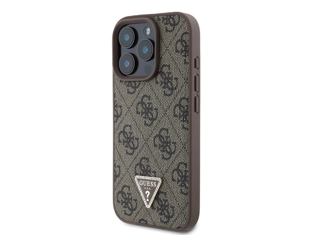 Guess PU 4G štrasový trojuholník s kovovým logom Zadný kryt pre iPhone 16 Pro Max Brown