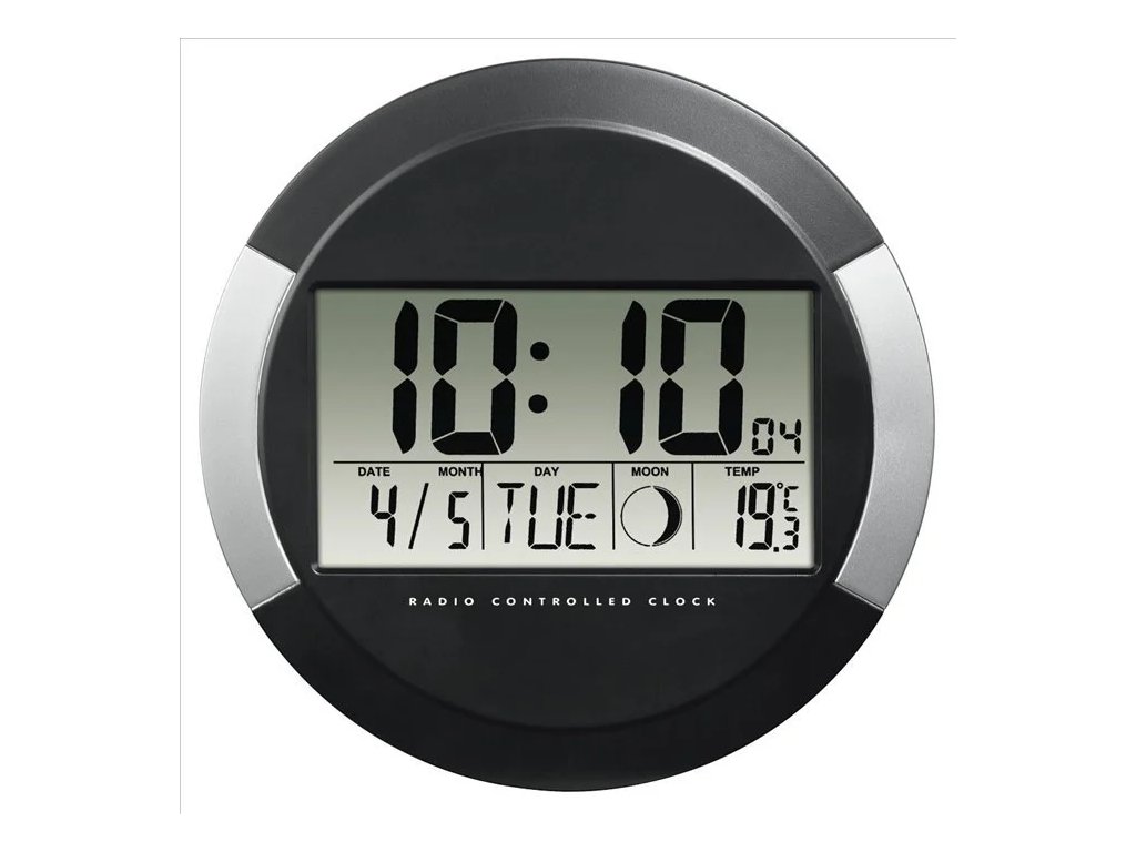 - nástenné hodiny riadené rádiovým signálom DCF (automatické nastavenie času podľa najpresnejších hodin na svete) - digitálne zobrazenie času, dátumu a vnútornej teploty - možnosť manuálneho nastavenia časového pásma, ak sa čas prijatý rádiovým signálom líši od času v časovom pásme - zobrazenie fázy mesiaca - indikácia slabej batérie - možnosť umiestnenia na rovný povrch (stôl, polička cm; dátum s teplotou - 2,3 cm - rozmery (priemer x hĺbka): 24,5 x 2,6 cm - hmotnosť: 420 g - batéria: 1x AA Mignon (súčasťou dodávky) - materiál: plast - farba: čierna Hodiny, budík, dátum: - Automatické prepnutie na letný čas, indikované- 24-hodinovým formátom zobrazenia času - Zobrazenie času: hodiny, minúty, sekundy - zobrazenie dátumu (deň v týždni/deň/mesiac) - výber zo 6 jazykov pre skratku dňa v týždni (angličtina, nemčina, francúzština, italčina, španielčina, holandčina) teploty - rozsah merania teploty: 0 °C až 50 °C Parametre Zobrazenie digitálne Materiál krytu Plast Materiál puzdra Plast Design Nástenné hodiny | Stolové hodiny Prevádzkový režim Rádio Ďalšie funkcie Dátum | Hodiny riadené signálom DCF Špeciálne funkcie Tiché, bezhlučné Hĺbka 2,6 cm Hmotnosť 420 g Priemer 24,5 cm Počet baterií 1 Typ batérie AA (Mignon) Farba ciferníka Sivá Farba puzdra čierna Produktová línia Home & Living Sekundy Displej Značka HamaDodatočné parametre