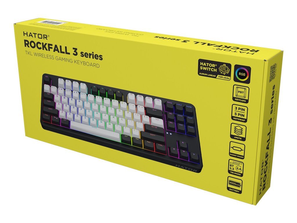 HATOR Rockfall 3 TKL Wireless - Bezdrôtová mechanická klávesnica s QMK/VIA Kompaktná mechanická klávesnica HATOR Rockfall 3 TKL Wireless (HTK850) bez numerickej časti je ideálnou voľbou pre tie, ktorí hľadajú vysoký výkon a pohodlí v menšom prevedení. Vďaka trom možnostiam pripojenia, dlhej výdrži batérie a prepracovanej vnútornej architektúre sa stane spoľahlivým spoločníkom na prácu aj zábavu. Kľúčové vlastnosti Tri možnosti pripojenia: Klávesnica ponúka flexibilitu s bezdrôtovým režimom 2,4 GHz na rýchly prenos signálu, univerzálnym pripojením Bluetooth 5.3 a tradičným káblovým pripojením cez USB typu C. Špičkové mechanické spínače: HATOR Aurum s predrezanými lineárnymi spínačmi poskytujú Sú vyrobené z vysokokvalitných komponentov, ako je nylonová základňa a pozlátené kontakty, čo zvyšuje ich odolnost. Optimalizovaný zvuk a pocit: Viacvrstvová izolácia hluku a vibrácií spolu s ručne mazanými stabilizátormi z prvotriedneho plastu POM zabezpečujú tichý a pohodlný provoz, vďaka ktorému sa môžete sústrediť na hru alebo prácu. Vysoko prispôsobené: Systém Hot-swap umožňuje jednoduchú výmenu spínačov bez nutnosti spájkovania. Klávesy PBT s profiláciou OMA a ukrajinským písmom sú odolné voči opotrebovaniu. Podpora QMK/VIA prostredníctvom webového rozhrania poskytuje širokú škálu možností prispôsobenia v akomkoľvek operačnom systéme, od nastavenia makier až po konfiguráciu podsvietenia. Dlhá výdrž batérie: Zabudovaná batéria s kapacitou 4000 mAh poskytuje až 160 hodín prevádzky. Plné nabitie trvá približne 8 hodín. Herné funkcie: Funkcia: 100% Anti-ghosting a N-Key Rollover zabezpečujú, že každý úder klávesu je zaznamenaný. Podsvietenie RGB so 16,8 miliónmi farieb, individuálne nastaviteľné pre každý kláves. Gaming (hrania) Lineárna, mechanická, hot-swap, HATOR Aurum Orange Aktivačné silá 38 g. 70 miliónov stlačení klávesov Rozloženie klávesnice: QWERTY Jazyk: ukrajinčina (na klávesoch) Formát: Bez klávesov (TKL) Rozhranie: USB + bezdrôtové RF (2,4 GHz) 1000 Hz Materiál klávesov: PBT (polybutyléntereftalát), dvojitý nástrek Dĺžka kábla: 1,8 m Hmotnosť: 943 g Rozmery (ŠxHxV): 364 x 144 x 44 mm Obsah balenia Bezdrôtová klávesnica HATOR Rockfall 3 TKL Nástroj použitie Síťový adaptér nie je súčasťou balenia.Dodatočné parametre