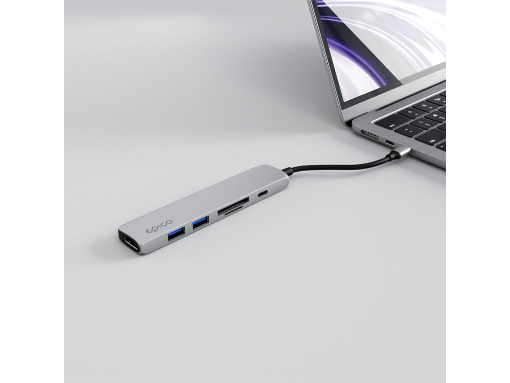 Hliníkový rozbočovač Epico 6v1 s konektorom USB-C je dokonalým príslušenstvom pre bezproblémové pripojenie a vynikajúci výkon. Hliníkové telo dokonale chladí jeho komponenty a vyzerá elegantne a minimalisticky. Výstup HDMI 2.1 podporuje rozlíšenie až 8K/30Hz a 4K/120Hz prostredníctvom USB-C. Rozbočovač podporuje aj dynamické HDR+ s až 12-bitovou farebnou hĺbkou a viackanálový zvuk vrátane Dolby Atmos a DTS:X cez HDMI. Vďaka technológii USB-C Power Delivery 3.0 dokáže rozbočovač spracovať až 100 W energie. Rozbočovač ponúka sloty na karty SD a MicroSD s podporou SDXC a UHS-I na jednoduchý prenos dát. Je tiež vybavený dvoma portami USB-A 3.0. ŠPECIFIKÁCIA: USB-C PD 3.0: podporuje 5V/9V/12V/15V/20V/3A, max. 100W nabíjanie 2x USB-A 3.0: prenos dát až do 5 Gb/s Port HDMI: 8K/30Hz, HDCP 1.4/2.2 Slot na kartu. UHS-1, až 124 Mb/s, kapacita až 2 TB Podporované zariadenia: MacBook, MacBook Pro, MacBook Air (2015 a novšie), iPad Pro 2018 a ďalšie zariadenia s USB-C Materiál: hliník, ABC, PC, TPE Rozmery: 28 × 120 × 10 mm Hmotnosť:Dodatočné parametre