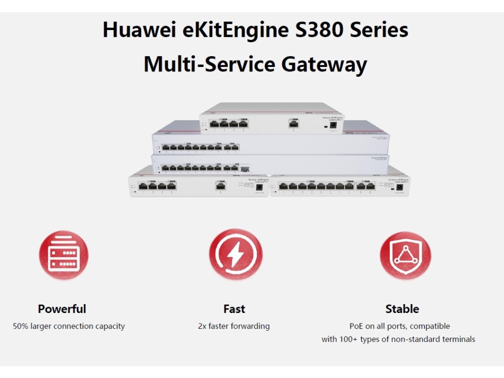 Špecifikácie produktu Multifunkčné brány Huawei eKitEngine série S380 zahŕňajú rôzne modely, napríklad so 4 elektrickými portami GE pre downlink, 8 elektrickými portami GE pre downlink (porty PoE/non-PoE) alebo portami GE pre uplink. Vďaka vlastnostiam, ako sú jednoduchá inštalácia a nasadenie a flexibilné ethernetové siete, sa tieto produkty môžu široko používať na vnútorné pokrytie na trzích malých a stredných podnikov, ako sú podnikové kancelárie SOHO, ekonomické hotely, továrne, základné a stredné školstvo a zabezpečenie budov. Špecifikácia Maximálny počet používateľov 250 Prepínacia kapacita 16 Gbit/s Rýchlosť odosielania paketov Nahrávanie: 500 Kpps, sťahovanie: 420 Kpps Šírka odchádzajúceho pásma 2 Gbit/s Pevný port WAN 2 x porty 10/100/100 10/100/1000BASE-T portov 2K vstupných adres MAC Rozmery šasi (vx š xh) 35 mm x 210 mm x 130 mm Výška šasi 1 U Hmotnosť v plnej konfigurácii (včetne obalových materiálov) 0,7 kg Typ napájacieho modulu Napájací adaptér Menovité2 50/60 Hz Rozsah vstupného napätia 90 VAC až 290 VAC, 47 Hz až 63 Hz Maximálna spotreba energie Bez PoE: 21,8 WS PoE: 145,8 W (PoE: 124 W) Dlhodobá prevádz. teplota 2 °C až 0 °C až +70 °C Relatívna vlhkosť 7 % až 95 % (bez kondenzácie) Režim rozptylu tepla Prirodzený rozptyl teplaDodatočné parametre
