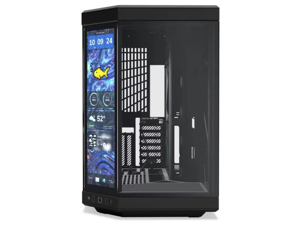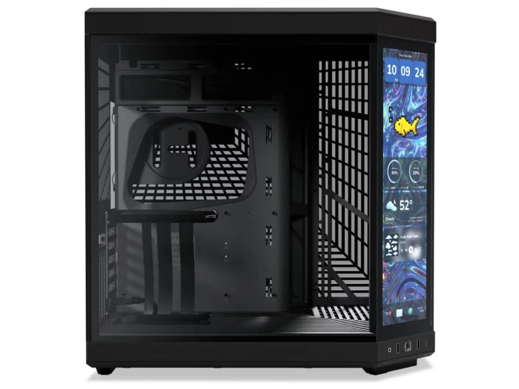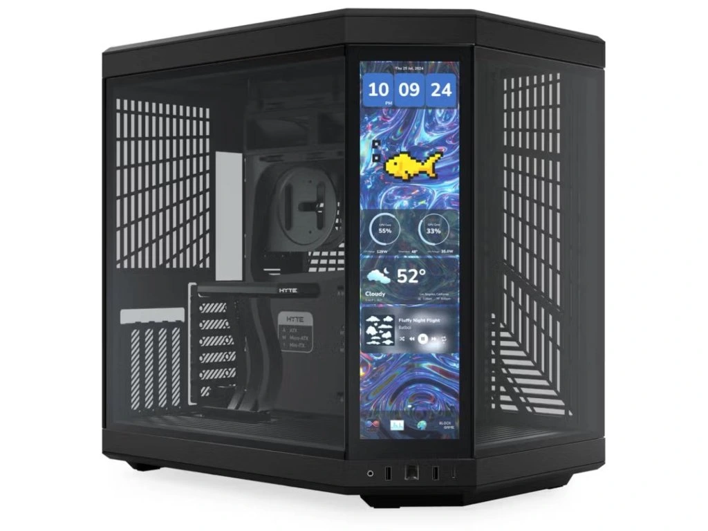 Dvojkomorová PC skrinka HYTE Y70 Pitch Black na prvý pohľad zaujme dotykovým IPS displejom, ktorý prehľadne zobrazuje systémové informácie, animácie alebo dokonca hudobný prehrávač.