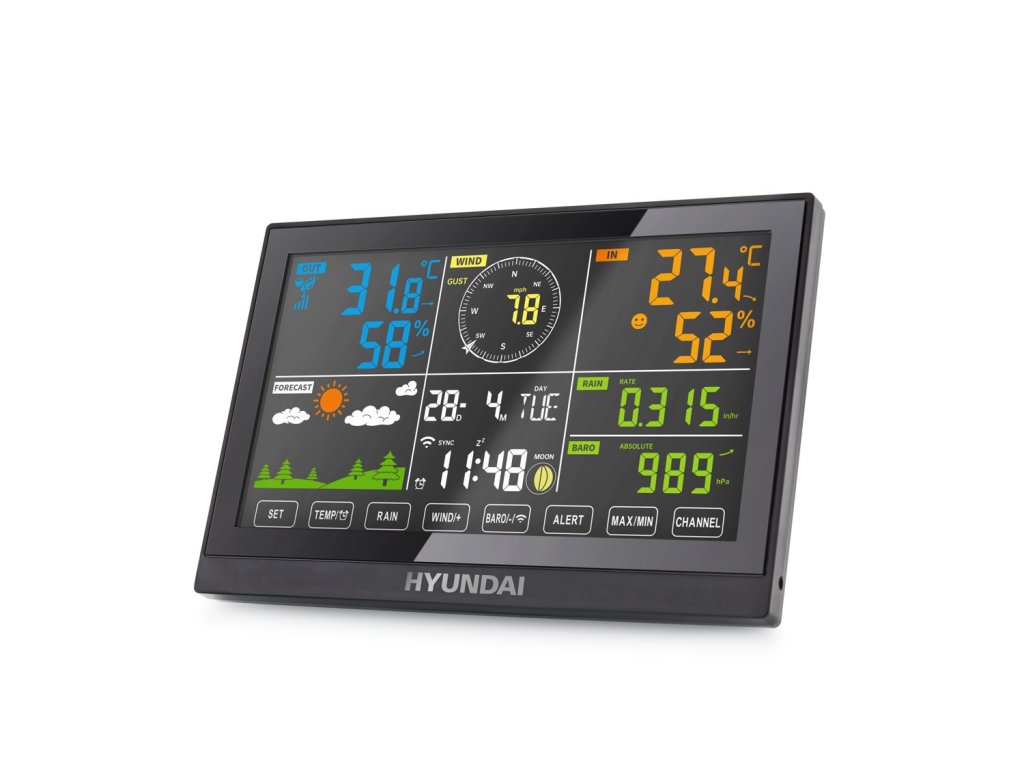 Funkcie Predpoveď počasia s animáciou Vnútorná a vonkajšia teplota Vnútorná a vonkajšia vlhkosť Barometrický tlak - absolútny alebo relatívny tlak Vývoj barometrického tlaku rýchlosť, smer a nárazy vetra Množstvo zrážok (za hodinu, za deň, za týždeň, za týždeň, celkovo) Čas riadený rádiovým signálom DCF 77 Budík Kalendár Fáza mesiaca Citeľná teplota MAX a MIN vnútornej a vonkajšej teploty MAX a MIN citeľná teplota a rosný bod MAX a MIN vnútorná a vonkajšia vlhkosť MAX a MIN absolútny alebo relatívny tlak vzduchu MAX a MIN rýchlosť a nárazy vetra MAX a MIN množstvo zrážok (za hodinu, za deň, za týždeň) Nastavenie výstrahy vnútornej/ vonkajšej teploty Nastavenie upozornenia na vnútornú/vonkajšiu vlhkosť Nastavenie výstrahy barometrického tlaku Nastavenie upozornenia na priemernú rýchlosť a nárazy vetra Nastavenie denného výstražného upozornenia na zrážky Prenos meraní a zdieľanie vlastných údajov do globálnej siete meteorologických staníc weathercloud.net Prenos meraní do siete Weather Underground Špecifikácie Rozmery (šírka × výška): 192 × 127 mm Napájanie hlavnej jednotky: adaptér (súčasť dodávky) alebo 3 × batérie AAA (nie sú súčasťou dodávky) Napájanie snímača: 3 × batérie AA (nie sú súčasťou dodávky), záložný solárny panel Všeobecné informácie: Typ: profesionálna meteorologická stanica Farba: čierna Napájanie: batérie AA, batérie AAA, napájací adaptér Dátum: Áno Kalendár: Na základe údajov z kalendára sa dá nastaviť dátum: Kalendár: Áno Podpora pamäťových kariet: Pamäťová karta: Nie USB: Nie Hyundai 40-mesačná záruka Hlavná jednotka a jej funkcie: Displej: farebný Teplota: vnútorná a vonkajšia Barometrický tlak: áno Fáza mesiaca: áno História tlaku: Nie Predpoveď počasia: áno Predpoveď počasia z internetu: Nie Príliv a odliv: Nie Tlak v baroch/trend počasia: Áno Wi-Fi: Áno Inteligentná funkcia: Nie Vlhkosť: vonkajšia, vnútorná Možnosť montáže na stenu: Áno Prídavný snímač: Bezdrôtový prenos zo snímača: Áno Dosah snímača v otvorenom priestore: 50 m Max. počet prídavných snímačov: 1 ks Senzor v balení: dažďový senzor, teplotný senzor, senzor vetra, senzor vlhkosti Časové informácie: Hodiny: Hodiny: Áno Čas západu a východu mesiaca: Nie Budík: Áno Opakované budenie: Áno Čas riadený rádiovým signálom DCF 77: Áno Integrácia systému SMART: Amazon Alexa: Nie Apple HomeKit: Nie Google Home: Nie Vlastný systém: Nie Rozmery výrobku:: Šírka: 19,2 cm Výška: 12,7 cm Hĺbka: 2,8 cm Hmotnosť: 0,31 kg Rozmery balenia: Šírka: 42,3 cm Výška: 33,8 cm Hĺbka: 17,0 cm Hmotnosť: 1,90 kgDodatočné parametre
