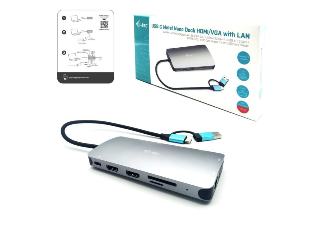 - Vysoká výkonná cestovná dokovacia stanica až pre tri monitory súčasne - Dokovacia stanica je kompatibilná s takmer všetkými súčasnými notebookmi (pripája sa cez porty USB 3.0, USB-C, USB4 alebo Thunderbolt™ 3/4). - Port HDMI 1 podporuje vysoké rozlíšenie až do 4K - Natívna podpora portu VGA pre staršie monitory alebo projektory - 5 portov USB (1x USB-C, 1x USB 3.2 a 3x USB 2.0) umožňuje jednoduché pripojenie zariadení a periférií USB - Sloty SD/microSD na jednoduchý prenos dát z pamäťových kariet - GLAN Ether Mb/sa poskytuje robustné vysokorýchlostné pripojenie k internetu. - Dokovacia stanica podporuje až 100 W napájanie pripojeného notebooku alebo tabletu Popis Výkonná, ale malá a prenosná dokovacia stanica, ktorá podporuje výstup až na tri externé monitory. Dokovaciu stanicu možno použiť prakticky s akýmkoľvek notebookom, pretože podporuje pripojenie ku všetkým bežným portom: USB 3.0, USB-C, USB4 a Thunderbolt" 3/4, pričom podporuje všetky bežné súčasné operačné systémy. Pripojenie k trom monitorom však bude možné len s notebookom s portom Thunderbolt 3/4 alebo portom USB-C, ktorý portom USB-C. USB, spolehlivé a rýchle pripojenie k firemnej sieti vďaka integrovanému portu LAN a natívna podpora VGA - to všetko robí z tejto dokovacej stanice ideálneho spoločníka pre profesionálov, ktorí sú často na cestách a potrebujú sa pripojiť aj k starším monitorom a projektorom. K dispozícii sú 2 porty HDMI a jeden port VGA - 1x USB 3.2, 1x USB-C a 3x USB 2.0 umožňujú jednoduché pripojenie zariadení USB a - Gigabitový Ethernet RJ-45 poskytuje spolehlivé, robustné a vysokorýchlostné pripojenie k internetu s podporou rýchlostí 10/100/1000 Mb/s - S Podporuje systém Windows 10/11, MacOS, Android, Linux a ChromeOS Port HDMI 1 bude fungovať len po pripojení k notebooku s portom ThunderboltTM 3/4, USB4 alebo USB-C, ktorý podporuje prenos videa (tzv. režim USB-C DP Alt) Ak je dokovacia stanica pripojená cez USB 3.0, cm kábel USB-C obsahuje adaptér USB-C na USB 3.0 - Dodávka energie: 100 W - Porty pre video: - 2x HDMI - 1x VGA - 1 monitor - 1x HDMI 1 až 4K/30Hz - 1 monitor - 1x HDMI 2 do 1080p/60Hz - 1 monitor - 1x VGA do 1 2 do 4K/30Hz + 1080p/60Hz - 2 monitory - HDMI 1 + VGA do 4K/60Hz + 1080p/60Hz - 2 monitory - HDMI 2 + VGA až 2x 1080p/60Hz - 3 monitory - HDMI 1 + HDMI 2 + VGA do 4 1x port USB-C 3.2 Gen. 10/11, macOS, Linux, Android, ChromeOS s najnovšími aktualizáciami - Jednoduchá inštalácia ovládačov (Windows, macOS, Ubuntu, Android) - Rozmery produktu: 127 x 60 x 18 mm - Hmotnosť výrobku: 122 g - Rozmery balenia: 190 x 98 x 43 mm hardvér: - Zariadenie s volným portom USB-A, USB-C, USB4 alebo Thunderbolt™ 3/4 Požiadavky na napájanie: - Zariadenia s volným portom USB-C, USB4 alebo Thunderbolt™ 3 s podporou "Power Delivery" Požiadavky na obrazový výstup portu HDMI 1: - Zariadenia s vol Mode" alebo portom Thunderbolt™ 3/4 Operačný systém: 1: - Operačný systém: Windows 10/11, macOS, Linux, Android, ChromeOS s najnovšími aktualizáciami Port HDMI 1 bude fungovať len po pripojení k notebooku s portom ThunderboltTM 3/4, USB4 alebo portom USB-C s podporou prenosu PríručkaDodatočné parametre