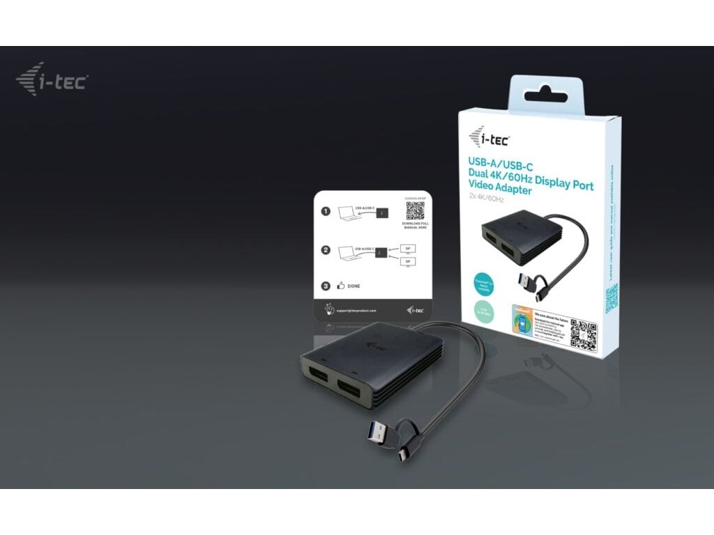 - Univerzálne pripojenie: kompatibilné s portami USB-C, USB-A a Thunderbolt - Výkonný a všestranný videoadaptér, ktorý dokáže pripojiť až dva monitory súčasne. - Adaptér podporuje rozlíšenie až 2x 4K/60 Hz bez ohledu na výkon grafickej karty vášho notebooku. - Podpora dvoch portov DisplayPort. - Kovový povrch pre lepší odvod tepla. - Dva externé monitory sú podporované aj na platformách Apple M1, M2 a M3. - Adaptér je kompatibilný so všetkými hlavnými operačnými systémami. Rozšírte svoju pracovnú plochu o dva externé monitory DisplayPort. Adaptér podporuje rozlíšenie 2x 4K 4096 × 2160@60 Hz vrátane zvukového signálu. Adaptér je vhodný pre dizajnérov, grafikov a ďalších používateľov, ktorí pracujú s viacerými obrazovkami súčasne. Jeho výkon umožňuje spúšťať aj tie najnáročnejšie aplikácie na jednom alebo dvoch nezávislých monitoroch, takže je ideálny na úpravu videa v rozlišení 4K/60 Hz alebo iné úlohy v rozlišení Ultra HD Vďaka režimom „Rozšírenie“ a „Zrkadlenie“ môžete pracovať s aplikáciami na dvoch monitoroch (napr. neustáleho preskakovania medzi otvorenými oknámi, zobrazovať panoramatické obrázky na dvoch monitoroch, zobrazovať grafy a aktuálne údaje súčasne, prezerať viacero prezentácií naraz bez toho, aby ste museli mať ďalší počítač atď. Pred použitím adaptéra je potrebná krátka jednorazová inštalácia ovládača DisplayLink. Ďalšie informácie nájdete na adrese http://www.i-tec.pro/setup-2. Špecifikácia - 1x integrovaný kábel USB-C/USB-A na pripojenie k hostiteľskému zariadeniu (27 cm) - Technológia grafického adaptéra: DisplayLink Video porty: DisplayPort: 2x DisplayPort Podporované rozlíšenia: 1 monitor 4K/60 Hz - Operačný systém: Windows 10/11, macOS, Android 5 alebo novší, Chrome OS R51 alebo novší, Linux Ubuntu - Rozmery výrobku: 75 x 60 x 15 mm - Hmotnosť výrobku: 80 g - Rozmery balenia: 180 x 130 x 8 hardvér: Zariadenie s volným portom USB-A, USB-C, USB4 alebo Thunderbolt™ 3/4 Obsah balenia - Produkt - QuickStartDodatočné parametre