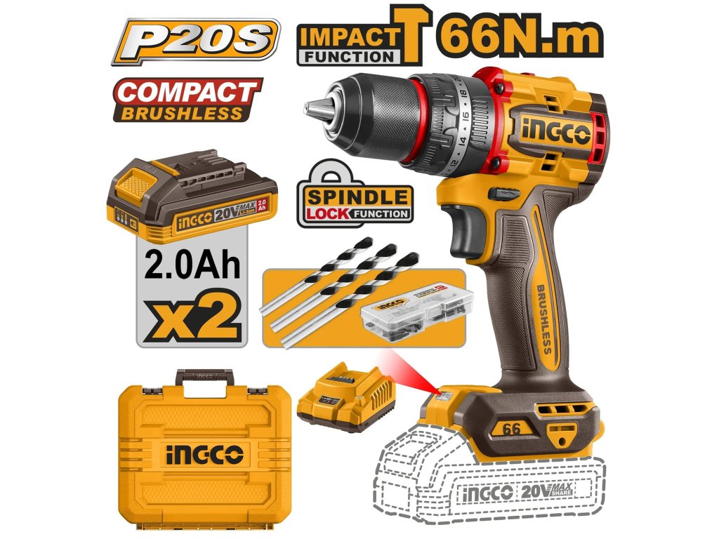 Ingco CIDLI20668E AKU vŕtací skrutkovač s príklepom, 60Nm, vrátane batérie 2ks a nabíjačky