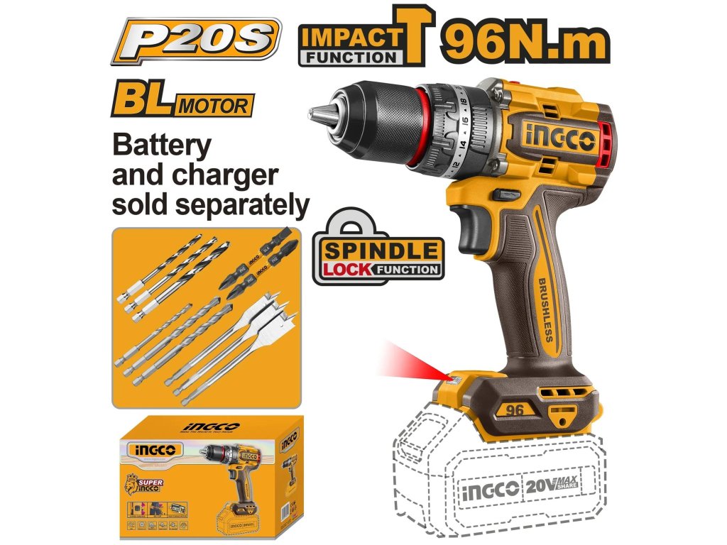 Ingco CIDLI209681 AKU šroubovák s příklepem, 96Nm,bez baterie a nabíječky