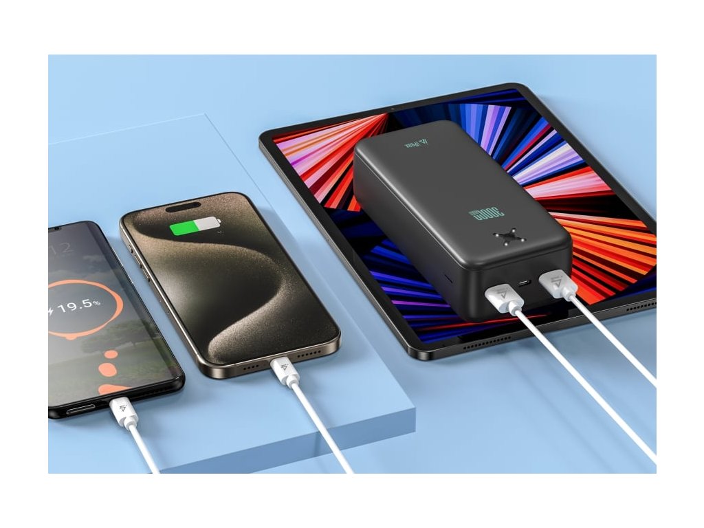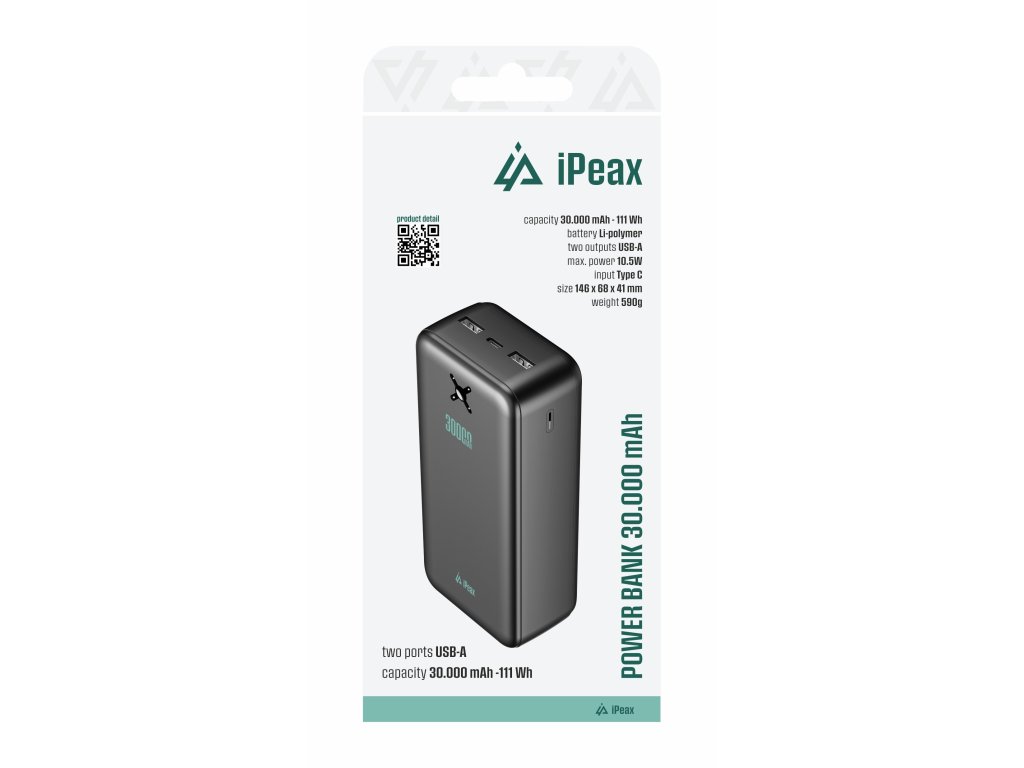 iPEAX POWER BANKA 30 000 mAh, 10,5 W, 2× USB-A, ČERNÁ Obrovská kapacita. Spolehlivost na maximum. Powerbanka iPEAX s kapacitou 30 000 mAh je spolehlivý zdroj energie pro všechny, kdo potřebují být online kdykoli a kdekoli. Ať už jste na vícedenním výletu, na služební cestě nebo potřebujete napájet více zařízení najednou, zvládne všechno s přehledem. Nabíjení je zajištěno dvěma USB-A porty a nabíjení samotné powerbanky probíhá přes USB-C vstup. Odolné provedení do každodenního nasazení Tělo z ohnivzdorného ABS plastu a polykarbonátu zaručuje dlouhou životnost i odolnost. Stav baterie jednoduše zkontrolujete pomocí LED diod. V balení navíc najdete i praktický USB-A – USB-C kabel, takže můžete nabíjet hned po vybalení. Klíčové vlastnosti: Extra vysoká kapacita 30 000 mAh pro dlouhé cesty i každodenní použití Dva USB-A výstupy s celkovým výkonem až 10,5 W Přehledné LED indikátory stavu nabití Odolné provedení z ohnivzdorného ABS a polykarbonátu Součástí balení je USB-A – USB-C kabel (2 A, 0,4 m) Elegantní černý design s decentním iPEAX logem Specifikace: Kapacita: 30 000 mAh (3,7 V, 111 Wh) Typ baterie: Li-Polymer Rozměry: 14,6 × 6,8 × 4,1 cm Hmotnost: 590 g Materiál: Ohnivzdorný plast ABS + Polykarbonát Indikátor nabití: LED diody Kabel v balení: USB-A – USB-C, 2 A, 0,4 m Vstup: USB-C: 5,0 V DC 2,1 A / Max. 10,5 W Výstupy: USB-A 1: 5,0 V DC 2,1 A / Max. 10,5 W USB-A 2: 5,0 V DC 2,1 A / Max. 10,5 W * Při současném nabíjení více zařízení se výkon 10,5 W dělí.Dodatočné parametre