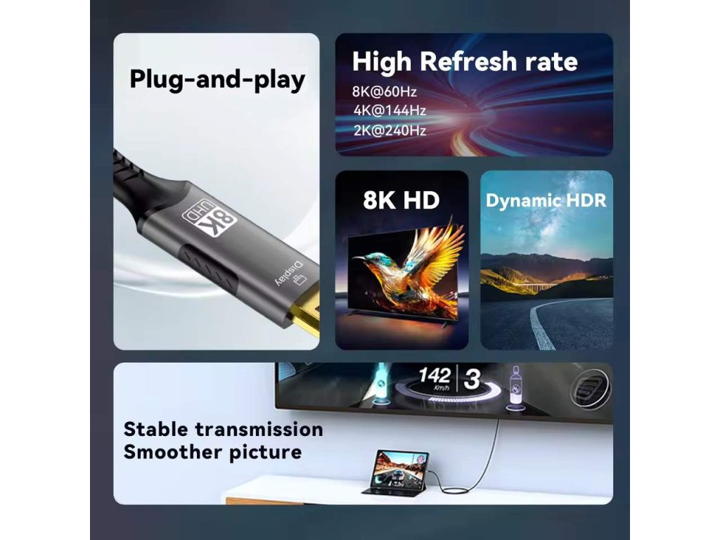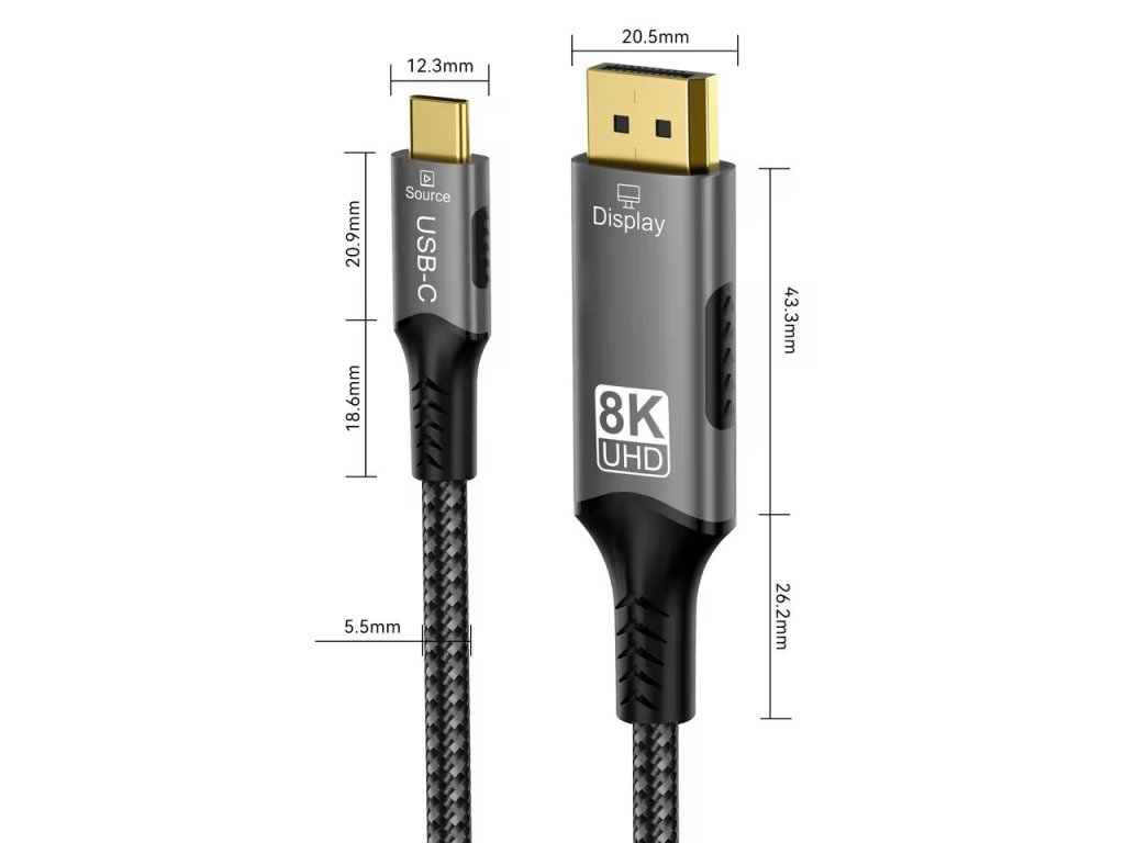PremiumCord USB-C samec na DisplayPort DP1.4 8K@60Hz samec 2 m Kábel s najnovšou prichádzajúcou špecifikáciou DP1.4, podporuje rozlíšenie až do 8K@60Hz s HDCP 2.2, umožňuje pripojenie a zobrazenie na najnovších monitoroch alebo televízoroch v rozlíšení ultra HD 8K@60Hz - Kábel USB-C na DisplayPort 1.4 - Rozlíšenie až do 8K@60Hz (7680x3840@60Hz), 4K@144Hz, 2K@240Hz a tiež FULL HD 1080P@240Hz - Umožňuje režim zobrazenia: Zrkadlenie + Rozšírenie + Duplikácia ( zobrazenie rovnakej alebo inej obrazovky alebo jedného obrazu na dvoch obrazovkách ) - Podporuje HDCP2.2 - Spätná kompatibilita s DisplayPort 1.3, 1.2, 1.1 a 1.0. - Tento adaptér umožňuje pripojiť počítač alebo smartfón s rozhraním USB-C k televízoru HDTV, monitoru alebo projektoru s rozhraním DisplayPort na zobrazenie na veľkej obrazovke. - Tento adaptér bol profesionálne otestovaný a skontrolovaný. - Je kompatibilný so špecifikáciou USB-C a určený pre zariadenia podporujúce alternatívne režimy DisplayPort - Široké využitie v prenosných počítačoch, tabletoch a smartfónoch. - Kábel umožňuje zobraziť rovnaký obraz alebo druhý obraz na externej obrazovke, tiež umožňuje vytvoriť rozšírenú pracovnú plochu na dvoch obrazovkách. - Obojstranné konektory typu C, ktoré možno voľne a obojstranne zasunúť. - Hliníkový kryt konektora - Pozlátené konektory - Farba kovového konektora: vesmírne sivá - Bavlnený opletený kábel - Balenie: závesné vrecko s popisom a čiarovým kódom EAN - Dĺžka kábla: 2 m - Funguje s novými zariadeniami s rozhraním USB-C podporujúcim DisplayPort Alternatívne režimyDodatočné parametre