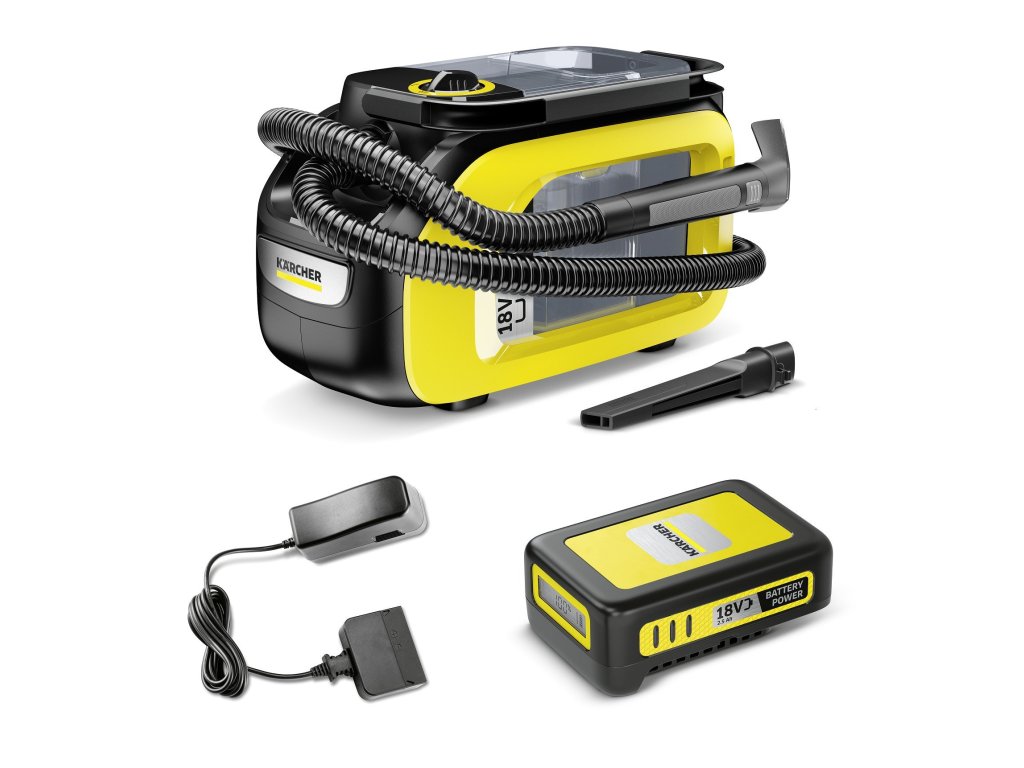 Hlboko do vlákien s maximálnou voľnosťou pohybu - extrakčný čistič SE 3-18 Compact Battery Set 2,5 čistí textilné povrchy dôkladne a čo je najlepšie, bez zvyškov.Vďaka kompaktnému dizajnu je zariadenie nielen praktické, ale vďaka 18V akumulátoru Kärcher Battery Power ho možno používať aj vtedy, keď nie je nablízku elektrická zásuvka. Vďaka tomu je čistenie interiéru vozidla dôkladné.