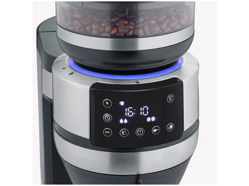Vlastnosti: - kávovar s integrovaným mlýnkem - nerezový kónický mlýnek - 5v1 - nastavitelný prostor na šálky, hrnky, termohrnky, skleněnou konvici a termokonvici - optimální teplota spařování 96°C - funkce deaktivace mechanismu mletí pro přípravu filtrované kávy z předem namleté kávy - funkce be-silent - nastavitelná funkce ohřevu až 60 minut - automatické vypnutí - možnost jednoduchého nastavení síly kávy - LED touch displej s časovačem - velký zásobník na zrnkovou kávu s kapacitou 235 g - opakovaně použitelný zlatý filtr - kapacita vodní nádržky: 2 l - výkon: 1520 W - kapacita: 10 šálků - barva: matná černá / broušená nerezová ocel - ukazatel hladiny vodyDodatočné parametre
