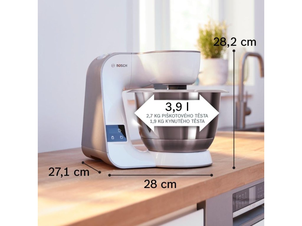 Kuchynský robot BOSCH MUM5XW10 Pre dokonalé výsledky: extrémne výkonný 1000 W motor si hravo poradí aj s veľmi ťažkými cestami - ľahko zpracuje aj 1 kg múky + prísady na hladké testo Veľká nerezová misa s objemom 3,9 l: špeciálne navrhnutý tvar na optimálnu prípravu kg kysnutého cesta) Integrovaný ukazovateľ času: majte cestá, krémy a smoothies vždy pod kontrolou. Na časovači vždy vidíte čas spracovania 3D planetárne miešanie: rýchle a dokonalé premiešanie všetkých prísad Automatická parkovacia poloha: pohodlná manipulácia a jednoduché plnenie vďaka automatickej parkovacej polohe nástavcov v zadnej časti misy Príkon 1000 W 7 rýchlostí Momentový stupeň 3,9 l Miešacia metla so silikónovým okrajom Výškovo nastaviteľná šľahacia metla Hnetací hák s ochranou prevodovky Puzdro na príslušenstvo Rozmery spotrebiča 282x280x271 mm Dĺžka prívodného kábla 110 cm Čistá hmotnosť 6,8 kg Dodávané príslušenstvo: 1 x nehrdzavejúcej ocele 1 x kovové hnetací háky 1 x strúhací kotúč 1 x kotúč na jemné strúhanie 1 x disk na krájanie a strúhanie 1 x krájací kotúč Farba biela/šampanskáDodatočné parametre
