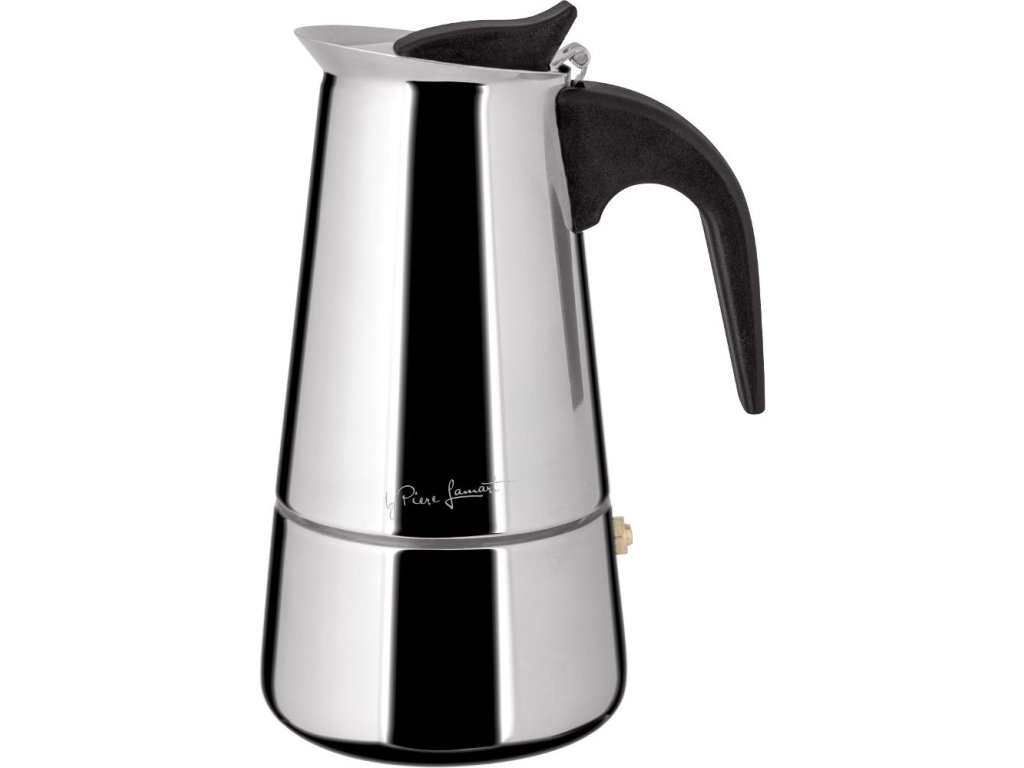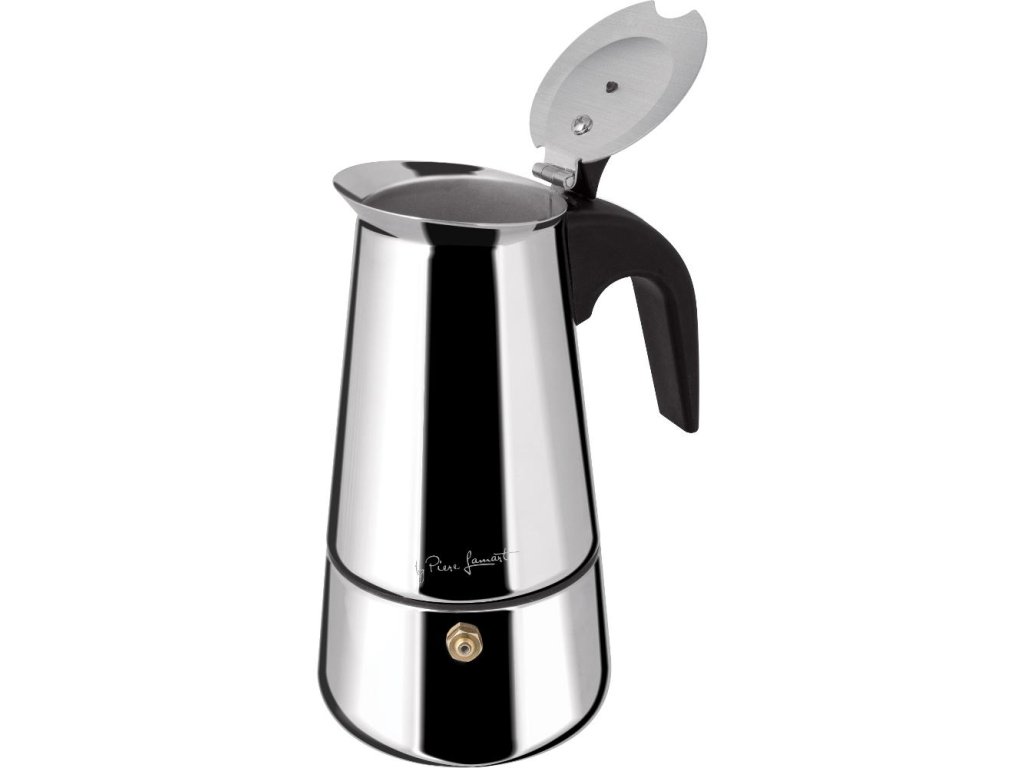 Čajník na tradičnú prípravu talianskej prekvapkávanej kávy espresso vyrobený z vysoko kvalitnej nehrdzavejúcej ocele 18/10. Štýlový kónický dizajn, ergonomická plastová rukoväť. Bezpečnostný ventil. Výrobok na zníženie tlaku. Na 6 šálok. Na použitie na všetkých varných doskách vrátane indukčných.Dodatočné parametre