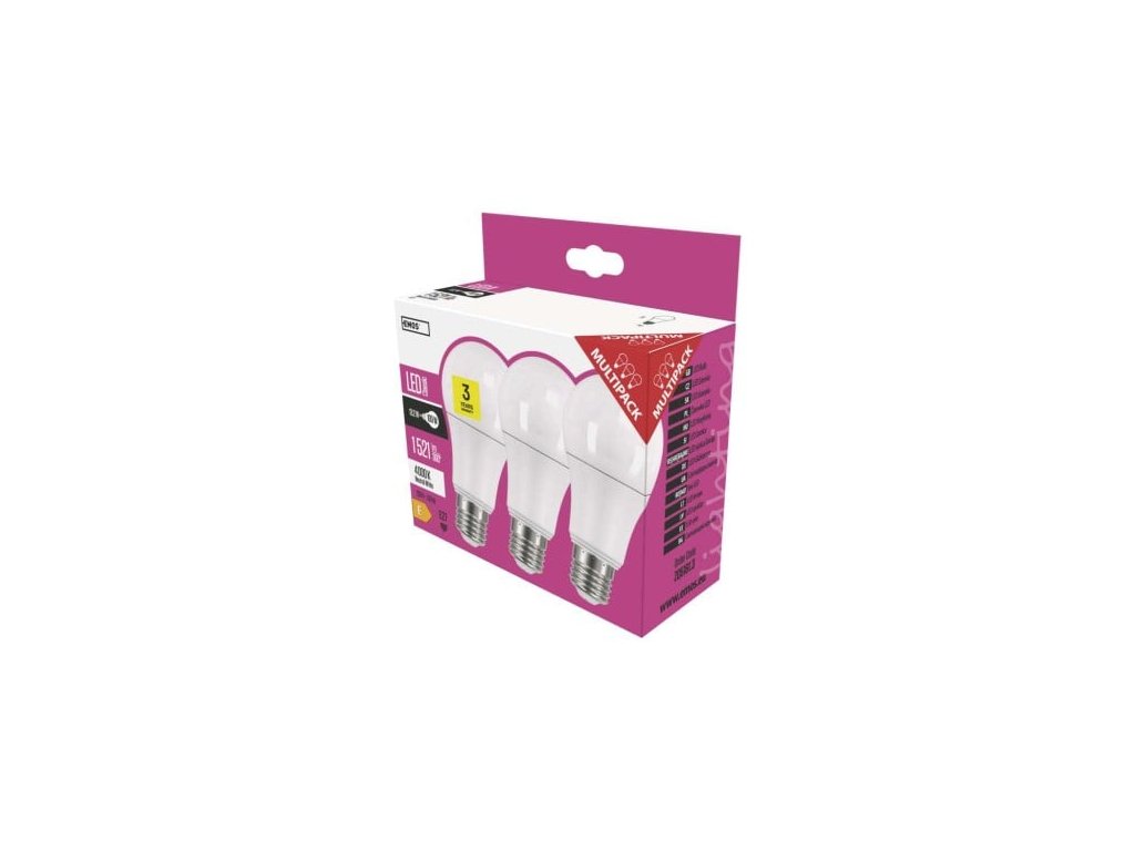 Balenie 3Ks Objednávacie číslo ZQ5E63.3 č. Séria CLASSIC stmievateľné nie tvar A60 teplota chromatickosti 4 000 K uhol vyžarovania 180° napätie 230 V~/50 Hz index podania farieb (CRI) 80 energetická trieda E životnosť 30 000 hodín Technológia LED počet čipov cyklov 30 000 svetelná účinnosť 117 lm/W podporovaný operačný systém - kompatibilita - protokol - ovládanie hlasovým asistentom nie Upozornenie do mobilnej aplikácie nie prenosová frekvencia - záručná doba 3 roky predajné balenie 3 ks, krabicaDodatočné parametre