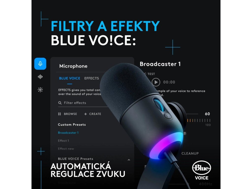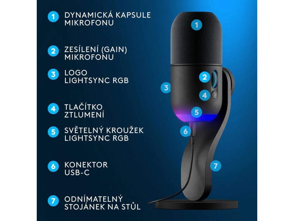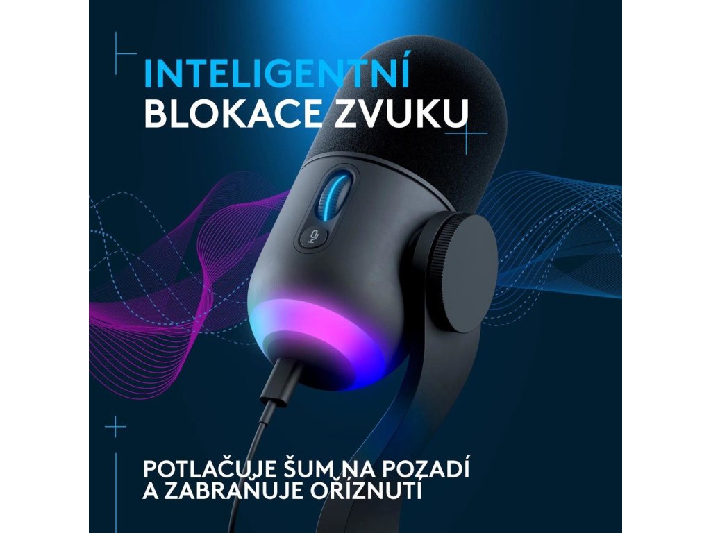 Logitech G Blue Yeti GX Dynamic RGB Dynamický herný mikrofón RGB s funkciou LIGHTSYNC. Logitech G Blue Yeti GX Dynamic RGB Navrhnutý špeciálne pre herných streamerov Špičkový herný mikrofón Logitech G Blue Yeti GX Dynamic RGB využíva technológiu LIGHTSYNC a jeho výhody ocení najmä hráči streamovacích her. Mikrofón kombinuje špeciálnu dynamickú kapsulu a pokročilý softvér, ktorý veľmi účinne potlačuje šum, cvakanie klávesov a zlepšuje celkový zvuk počas streamovania. Superkardioida CHARAKTERISTIKA LIGHTSYNC RGB BACKGROUND dynamický TYP KAPSULE 60 HZ - 18,5 KHZ FREKVENČNÁ ODOZVA 78 dB ODSTUP SIGNÁLU OD ŠUMU Logitech G Blue Yeti GX Dynamic RGB Tak dynamický, ako ste je vybavený dynamickou kapsulou so superkardioidnou smerovou charakteristikou, ktorá zaručuje špičkový a plynulý zvuk v štýle vysielania. Jeho poutavý dizajn štýlovo doplňuje dvojzónové podsvietenie LIGHTSYNC RGB, vďaka čomu sa stane neprehliadnuteľným prvkom vašej hernej zostavy. Logitech G Blue Yeti GX Dynamic RGB MODRÉ VO!CE FILTRY A EFEKTY Využiť môžete aj softvér Blue VO!CE, ktorý chráni pred orezaním a umožňuje vám viac sa sústrediť na vyhľadávanie ideálnych nastavení zvuku. Logitech G Blue Yeti GX Dynamic RGB Ovládajte mikrofón Logitech G Blue Yeti GX Dynamic RGB pomocou G HUB-u Pomocou softvéru G HUB budete môcť ovládať nielen mikrofón Logitech G Blue Yeti GX Dynamic RGB, ale aj všetky svoje zariadenia Logitech G - herné myši, klávesnica, svetlá Litra a ďalšie. Všetko tak budete mať na jednom mieste pre rýchle a jednoduché ovládanie nastavenia. Logitech Blue Yeti GX Dynamic RGB MicroFon iNTELIGENTNE BLOKUJE HLUK Logitech Blue Yeti GX Dynamic RGB je vybavený analógovým obmedzovačom na ovládanie zosilnenia. Ten účinne zabraňuje orezaniu. Klesajúci expander potlačuje šum na pozadí.Dodatočné parametre
