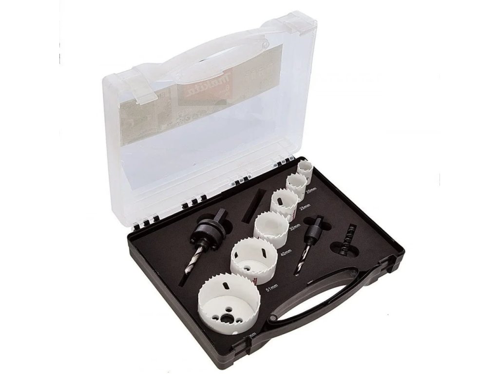 Makita D-47117 sada otvorových píl BiM (so závitom): 19, 22, 29, 38, 44, 57mm 2x adaptér 2x strediaci vrták HSS-G, 10ks