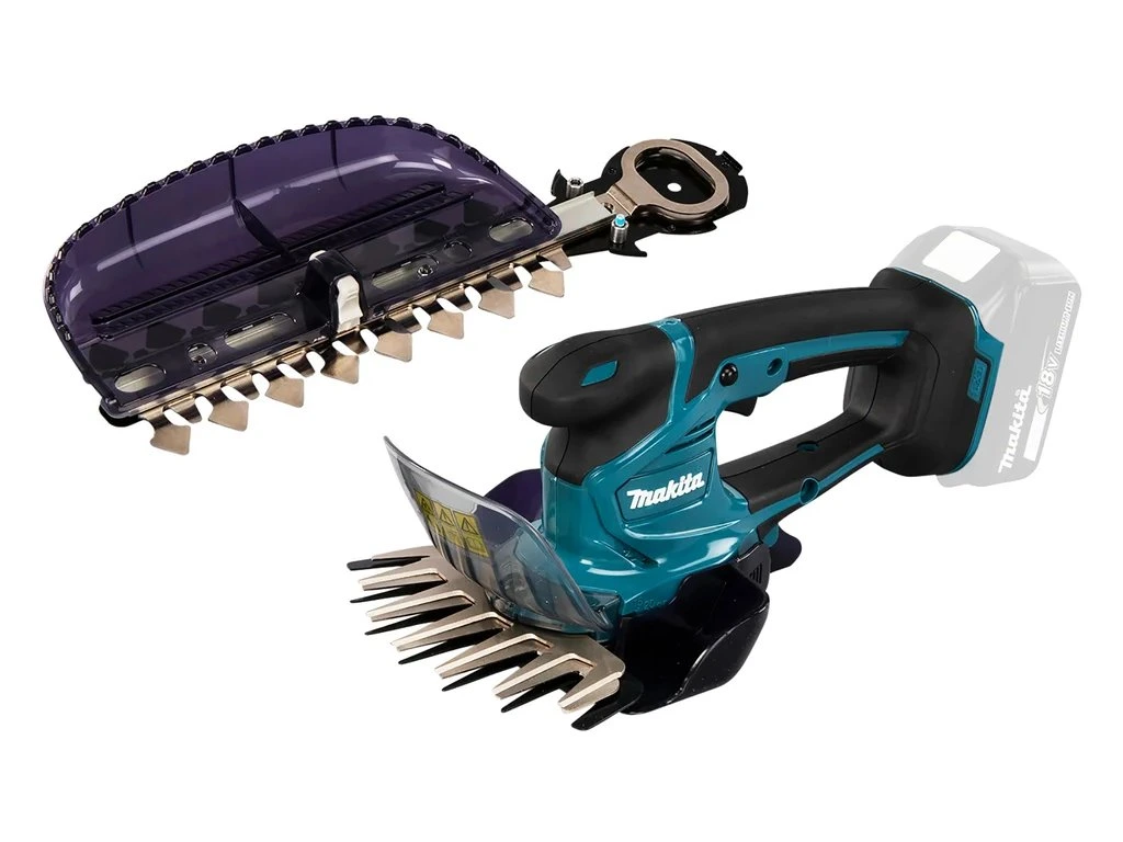 Nožnice na trávu, s možnosťou rýchlej premeny na plotostrih Beznástrojová výmena nástrojov Špeciálne brúsené ostrie so šírkou 16 cm Možnosť nastavenia výšky trávy 10/15/20/25 mm LED indikátor slabého nabitia akumulátora alebo preťaženia stroja Možnosť dokúpenia predĺženej rukoväte Balenie bez akumulátora a nabíjačky. Akumulátor Li-ion 18V Počet kmitov 2500 min-1 Šírka rezu 160 mm Nastavenie rezu výška 15/20/25mm Pre plochu do 225 m2 s BL1830 Hmotnosť 1,7 kg Rozmery (DxŠxV) 353 x 177 x 1 (457426-1) Kryt noža (452055-5) Nôž (195267-4) Kryt noža plotostrihu (451816-0) Nôž plotostrihu (198408-1) 3 ročná záruka po registrácii, viac informácií na www.makita.sk/predĺženieDodatočné parametre