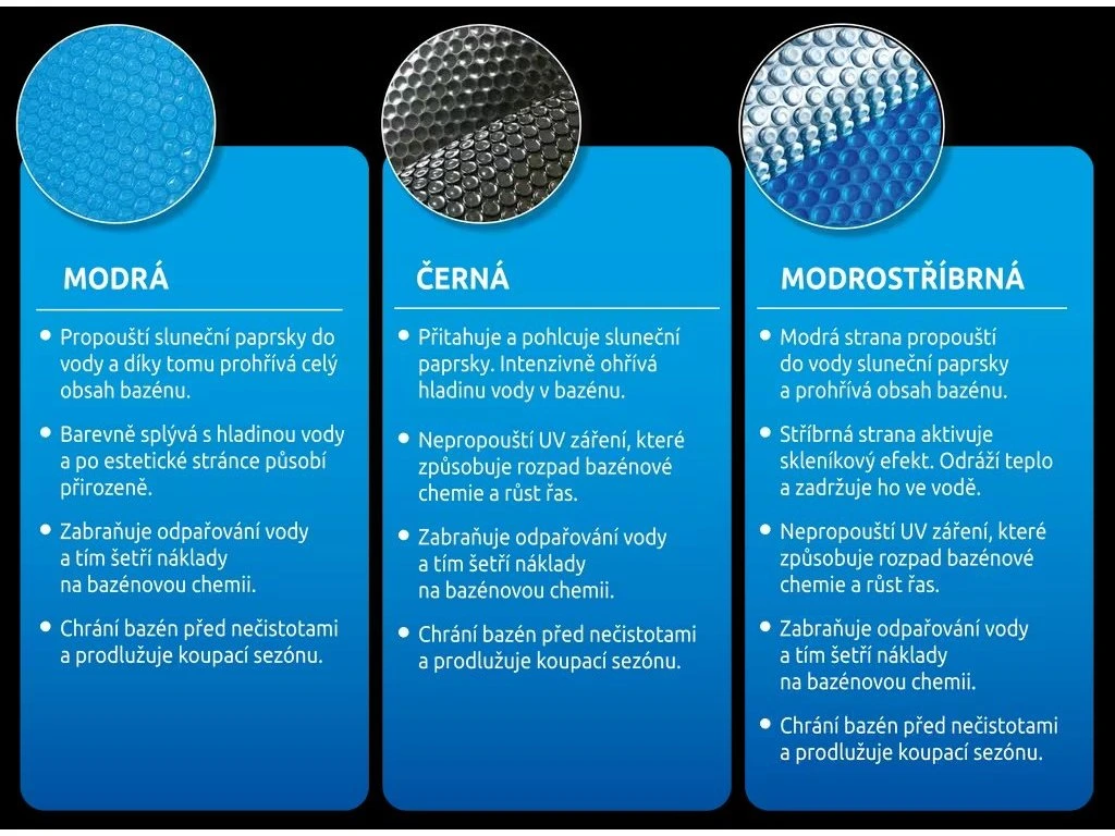 Popis produktu:Slnečné paprsky prenikajú cez solárnu plachtu a ohrievajú vodu bezprostredne pod hladinou. Bublinky pôsobia na slnečné svetlo ako čočky a zvyšujú teplotu vody. V noci zabraňujú odparovaniu vody, chemických látok a ochladzovaniu vody. Solárna plachta tiež čiastočne chráni pred padaním nečistôt do bazéna. Solárna plachta je vyrobená z modrej bublinkovej polyetylénovej tepelnej izolácie. Solárna plachta je vhodná pre všetky bazény s priemerom hladiny 3,6 m (napr. pre Floridu 3,66 m, Orlando 3,66 m). Rozmerová odchýlka: Povolená rozmerová odchýlka je ±2 %. Prečo si vybrať túto solárnu plachtu: Prenáša slnečné paprsky do vody a tím ohria celý obsah bazéna. Farba splýva s vodnou hladinou a esteticky pôsobí prirodzene. Zabraňuje odparovaniu vody, a tím šetrí náklady na bazénovú chemiu. Chráni bazén pred znečistením a predĺžuje plaveckú sezónu. Rozmery 1 baleného kusu: výška - 40,00 cm; šírka - 40,00 cm; dĺžka - 30,00 cm; hmotnosť: 0,80 kg. 2 ks v skupinovom balení.Dodatočné parametre
