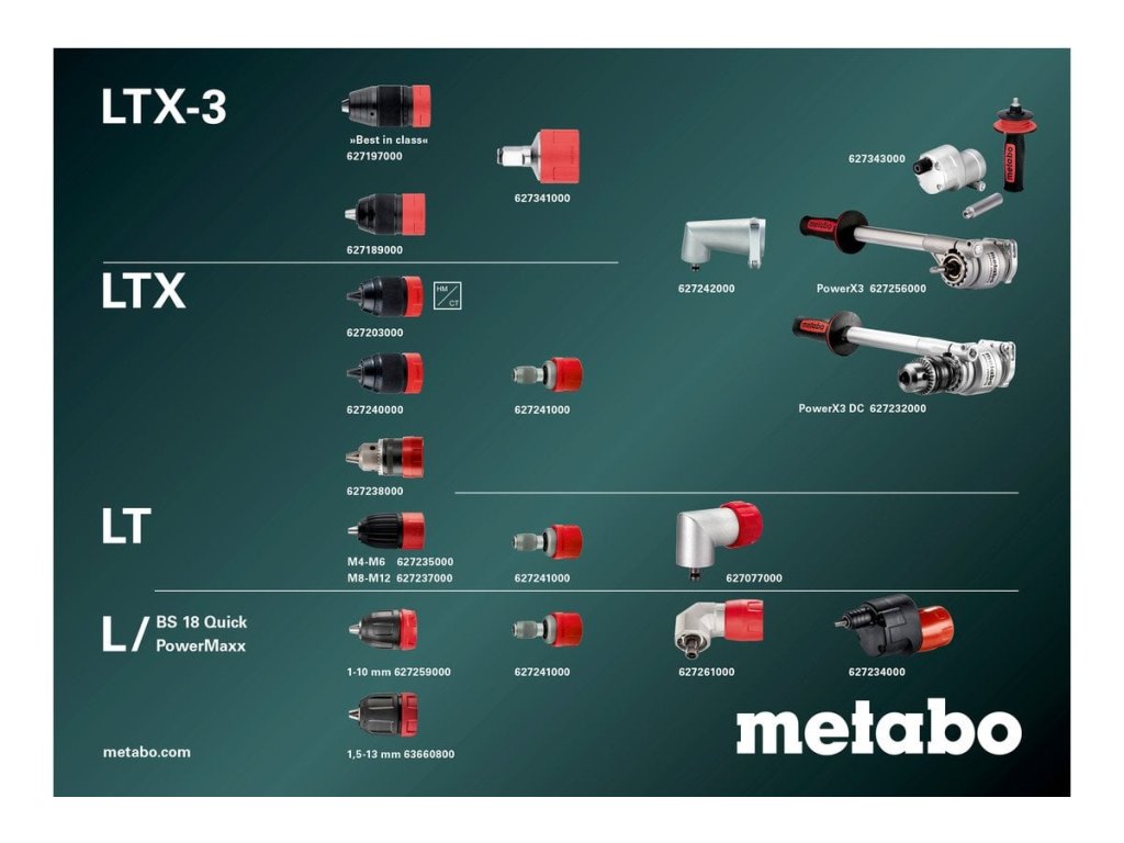 Maximálne výkonný bezuhlíkový vrtací skrutkovač pre najnáročnejšie aplikácie Systém Metabo Quick: rýchla výmena skľučovadla, držiaka bitov, uhlového adaptéra a ďalších prvkov pre flexibilnú prácu. Pulzný režim na odskrutkovanie pevných skrutiek a vŕtanie hladkých povrchov Magnetické vnútorné šestihranné vřeteno pre skrutkovacie bity na prácu bez skľučovadla Presný doraz: Elektronická momentová spojka s vyššou presnosťou na presnú a jemnú prácu Variabilné otáčky, pravý a ľavý chod preťaženiu: chráni motor pred prehriatím Euro skľučovadlo (O 43 mm) na všestranné použitie Elektronické bezpečnostné vypínanie: žiadny spätný náraz pri zablokovaní vŕtačky - pre vysokú úroveň ochrany používateľa Integrovaná LED pracovná lampa s funkciou podsvietenia pre optimálny jas v pracovnej oblasti S praktickým klipom na stranu Mnoho značiek, jeden bateriový systém: tento výrobok možno kombinovať so všetkými 18 V akumulátormi a nabíjačkami značiek CAS Technické špecifikácie Typ akumulátorových článkov LiPOWER Napätie akumulátora 18 V Maximálny krútiaci moment mäkký 65 Nm Pulzný krútiaci moment 65 Nm Max. krútiaci moment tvrdý 130 Nm Nastaviteľný krútiaci moment 1 - 20 Nm Priemer vrtáka do ocele 13 mm Priemer vŕtania do mäkkého dreva 68 mm Voľnobežné otáčky 0 - 550 / 0 - 2000 / min Rozpätie skľučovadla 1,5 - 1 akumulátora1 ,7 kg Hmotnosť vrátane akumulátora 2,1 kg Vibrácie Vŕtanie do kovu 2,2 m/s2 Nejistota merania K 1,5 m/s2 Emisie hluku Hladina akustického tlaku 76 dB(A) Hladina akustického výkonu (LwA) K 37 dB(A) Neisto Rýchlovýmenné skľučovadlo Rýchlovýmenný držiak bitov Prídavná rukoväť Klip na opasok a držiak bitov metaBOX 145 LDodatočné parametre