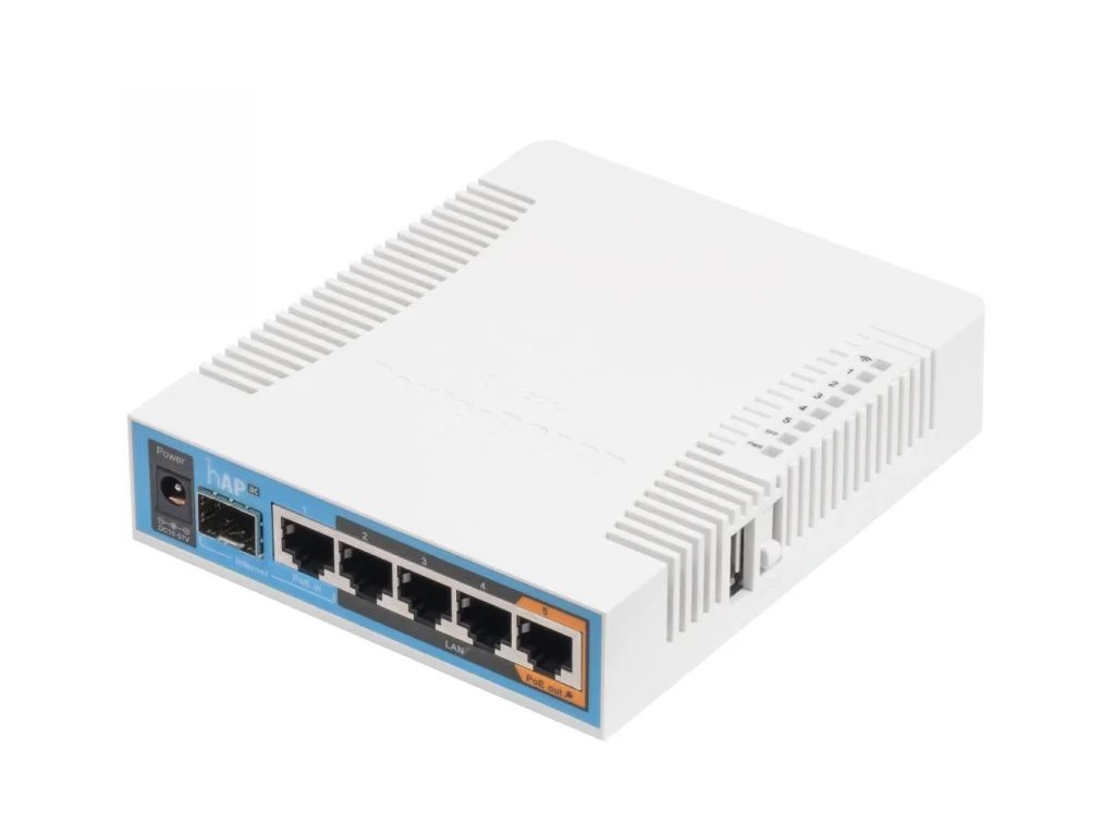 ual Band WiFi router od MikroTiku s ozačením hAP ac prípadne RB962UiGS-5HacT2HnT v desktop prevedení s 2 integrovanými rádiovými časťami s podporou 802.11a/b/g/n/ac umožňujúci súčasnú prevádzku v oboch pásmach. Rádiová časť 2.4 aj 5 GHz podporuje až 3x3 MIMO. Zariadenie obsahuje 1x SFP a 5x Gigabit Ethernet umožňujúci prenosovú rýchlosť až 1Gbps. Posledný port umožňuje funkciu PoE Out pre napájanie ďalšieho zariadenia – napr.: SXT jednotky na streche domu. Napájať jednotku je možné dvoma spôsobmi a to buď cez pasívne PoE na porte č.1 alebo cez DC konektor. Jednotka je dodávaná vrátane L4 licencie a plnohodnotného USB 2.0 portu s maximálnou prúdovou záťažou 700mA. Obsah balenia Zariadenie Napájací adaptér 24V / 1.2ADodatočné parametre