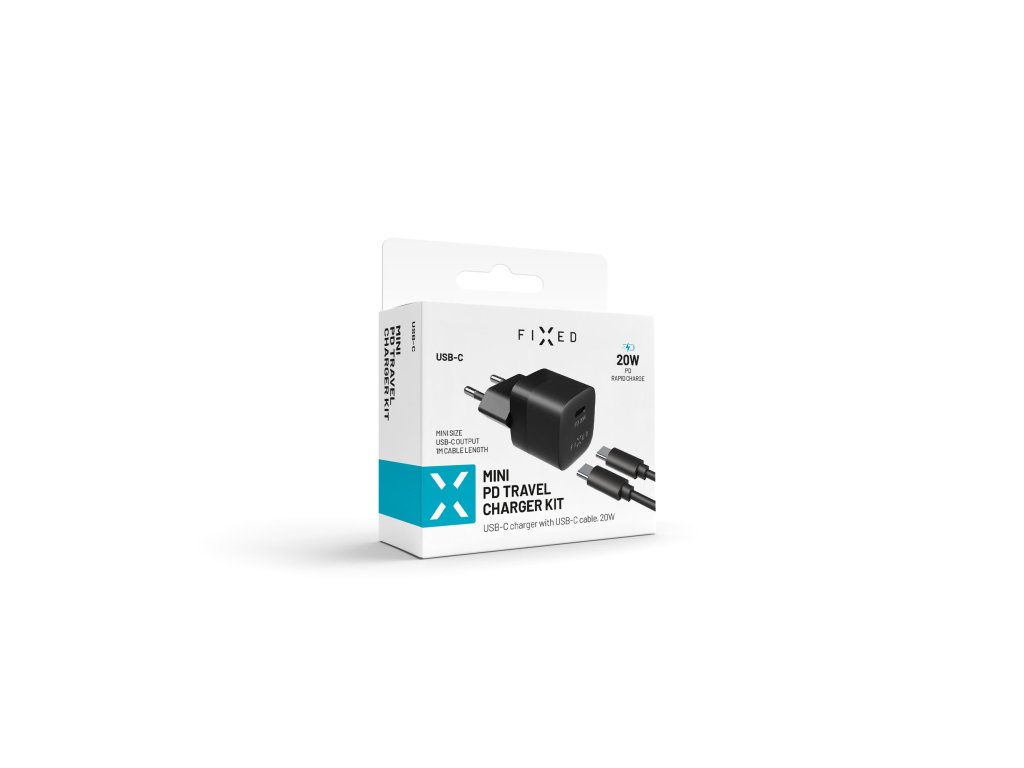 Mini sieťová nabíjačka FIXED s výstupom USB-C a káblom USB-C/USB-C, podpora PD, 1 meter, 20 W, čierna