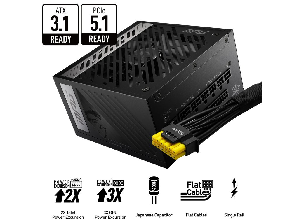 MSI MPG A850G PCIE5 850W napájací zdroj je vybavený tichým, ale výkonným 135 mm veľkým ventilátorom s ložiskom FDB. Zdroj spĺňa certifikáciu 80PLUS Gold, štandard ATX 3.1 a má odpojiteľné káble. ZÁKLADNÉ ŠPECIFIKÁCIE Výkon: 850 W Veľkosť ventilátora: 135 mm Certifikácia: 80PLUS Gold Napájacie konektory: 1x ATX 20+4-pin, 2x EPS 4+4-pin, 6x PCIe 6+2-pin, 1x PCIe 14+4 Rozmery: 150 x 150 x 86 mm Po uplynutí záručnej doby poskytovanej predajcom/distribúciou ponúka MSI na tento produkt bezplatnú opravu počas 7 rokov vo svojom servisnom stredisku v EÚ, registraciu objednávky môžete vykonať na webovej stránke MSI tu (https://sk.msi.com/support). Bezplatná oprava je podmienená dostupnosťou náhradných dielov a nevzťahuje sa na škody spôsobené užívateľom alebo zanedbaním údržby.Dodatočné parametre