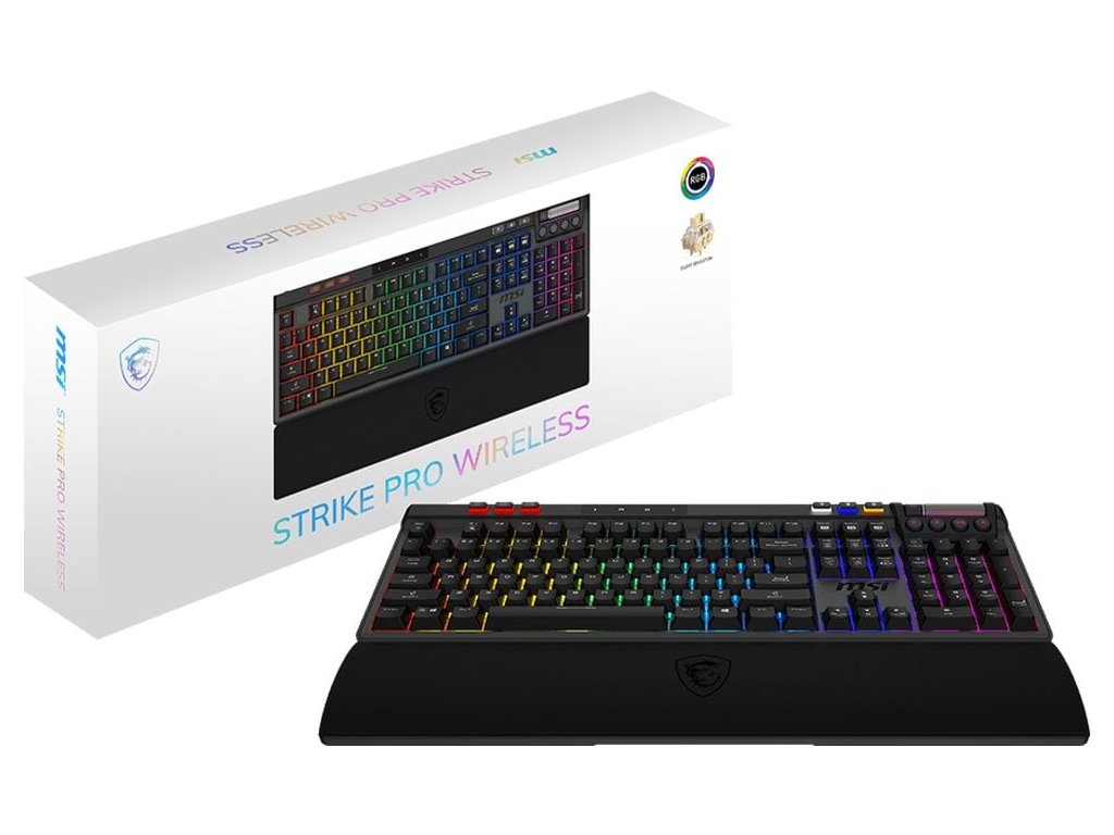 MSI STRIKE PRE Wireless Silent US Špičková herná mechanická klávesnica s revolučnými tichými spínačmi a trojitou konektivitou. Predstavujeme prémiovú hernú klávesnicu s mechanickými spínačmi Kailh Midnight Pro Silent Tactile so 45 g aktivačnou silou a hmatovou spätnou väzbou. Klávesnica je vybavená konštrukciou vymeniteľnou za prevádzky, ktorá umožňuje výmenu spínačov bez nutnosti spájkovania, a podporuje trojitú konektivitu – bezdrátové pripojenie 2,4 GHz, pripojenie Bluetooth a pripojenie USB. Vďaka výkonnej lithium-iónovej batérii s kapacitou 4200 mAh poskytuje až 1500 hodín používania a nabije sa len za 7 hodín. Klávesnica je vybavená podsvietením RGB Mystic Light nastaviteľným pre každý kláves, magnetickou opierkou zápästia z pamäťovej peny a pokročilou tlumiacou konštrukciou na minimalizáciu nežiaducich zvukov. Tiché mechanické spínače Kailh Midnight Pro so životnosťou viac ako 70 miliónov stlačení Hot-swap konštrukcia na jednoduchú výmenu spínačov bez nutnosti spájkovania (kompatibilita s 5pinovými spínačmi) Trojitá konektivita: 2,4 GHz, Bluetooth a USB/USB-C Výkonná 42 rýchlym nabíjaním Podsvietenie RGB Mystic Light pre jednotlivé klávesy s možnosťou synchronizácie Pokročilá konštrukcia tlmenia na minimalizáciu efektov ping a ozveny inteligentným dvojdotykovým koleskom Pokročilé herné funkcie Klávesnica podporuje plný N-key rollover s kompletnou technológiou anti-ghosting na presné zachytenie všetkých súčasne stlačených klávesov. Kompatibilná so systémami Windows 10, 11 a novějšími. Kompletné príslušenstvo V balení nájdete 2m opletený kábel USB, univerzálny spínač a nástroj na vyťahovanie klávesov, magnetickú opierku zápästia z pamäťovej peny a magnetický adaptér USB-C pre maximálne jednoduché používanie. Prvotriedne spracovanie Robustná konštrukcia s rozmermi 443 × 150 × 41 mm a hmotnosťou 1200 g zaručuje stabilitu počas intenzívneho hrania. Farbou sublimované klávesy PBT odolávajú opotrebovaniu a zachovávajú si prémiový pocit pri písaní. ZÁKLADNÉ ŠPECIFIKÁCIE Model: MSI Strike Pro Wireless Pripojenie: 2,4 GHz / Bluetooth / USB 2.0 Spínače: Kailh Midnight Pro Silent Tactile (45 g, dotykové) Životnosť spínača: 70+ miliónov stlačení Podsvietenie: RGB Mystic Light pre jednotlivé klávesy (až 1500 hodín) Lokalizácia: USA Anti-ghosting: úplné prevrátenie klávesov N Operačný systém: Windows 10, 11 (alebo novší) Rozmery: 443 × 150 × 41 mm Hmotnosť: 1200 g Kabel: 2 m opletený USBDodatočné parametre