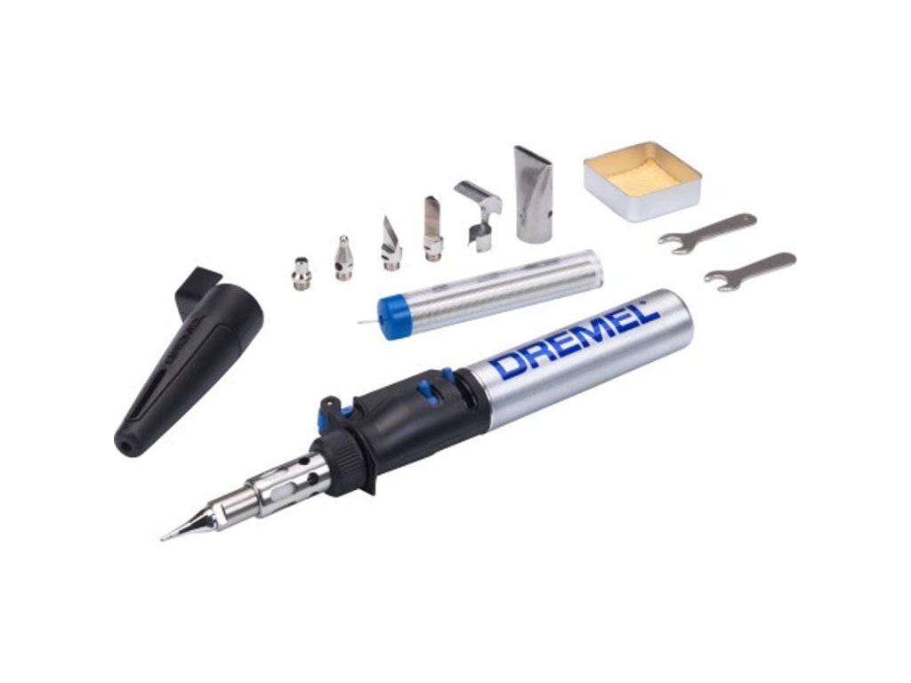 Multifunkčná butánová spájkovačka Dremel VersaTip Dremel VersaTip je univerzálna bezdrôtová plynová spájkovačka na bután, ktorá je ideálna na širokú škálu projektov, od spájkovania a pyrografie až po rezanie a tavenie za tepla. Vďaka bezšnúrovej konštrukcii, integrovanému piezoelektrickému zapaľovaniu a bohatej súprave príslušenstva je práca s ňou rýchla a pohodlná. Kľúčové vlastnosti a špecifikácie Všestranný: So siedmimi vymeniteľnými doplnkami (spájkovací hrot, hrot na rezanie za tepla, tvarovací hrot, pyrografický hrot, široká plamenná tryska, hrot na horúci vzduch a deflektor) zvládnete šesť rôznych aplikácií. Regulácia teploty a plameňa: Funkcia uzamknutia plameňa umožňuje nepretržitú prevádzku, čo je ideálne pre dlhšie projekty. Zapaľovač používa komerčne dostupný bután (nie je súčasťou dodávky). Plná nádržka (12 ml / 7 g) poskytuje až 90 minút prevádzky, pričom doplnenie je veľmi rýchle. Bezpečnosť. Špecifikácie: Hmotnosť: 0,135 kg Piezoelektrické zapaľovanie. Doba horenia: až 90 minút Teploty: Otvorený plameň: 1 200 °C Horúci vzduch: 680 °C Tipy: 550 °C Obsah balenia: Dremel VersaTip 7 kusov príslušenstva (spájkovací hrot, teplovzdušná hlava, horúci rezací nôž, plochá široká tryska, reflektor, rezací nôž) Cínová spájkovačka s modrou krytkou Spájkovací cín a cínové puzdro Krabička s hubkou na čistenie spájkovacieho hrotu Návod na obsluhuDodatočné parametre