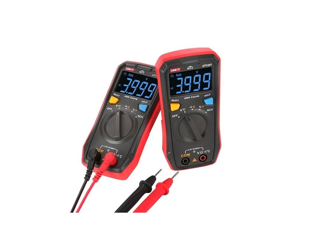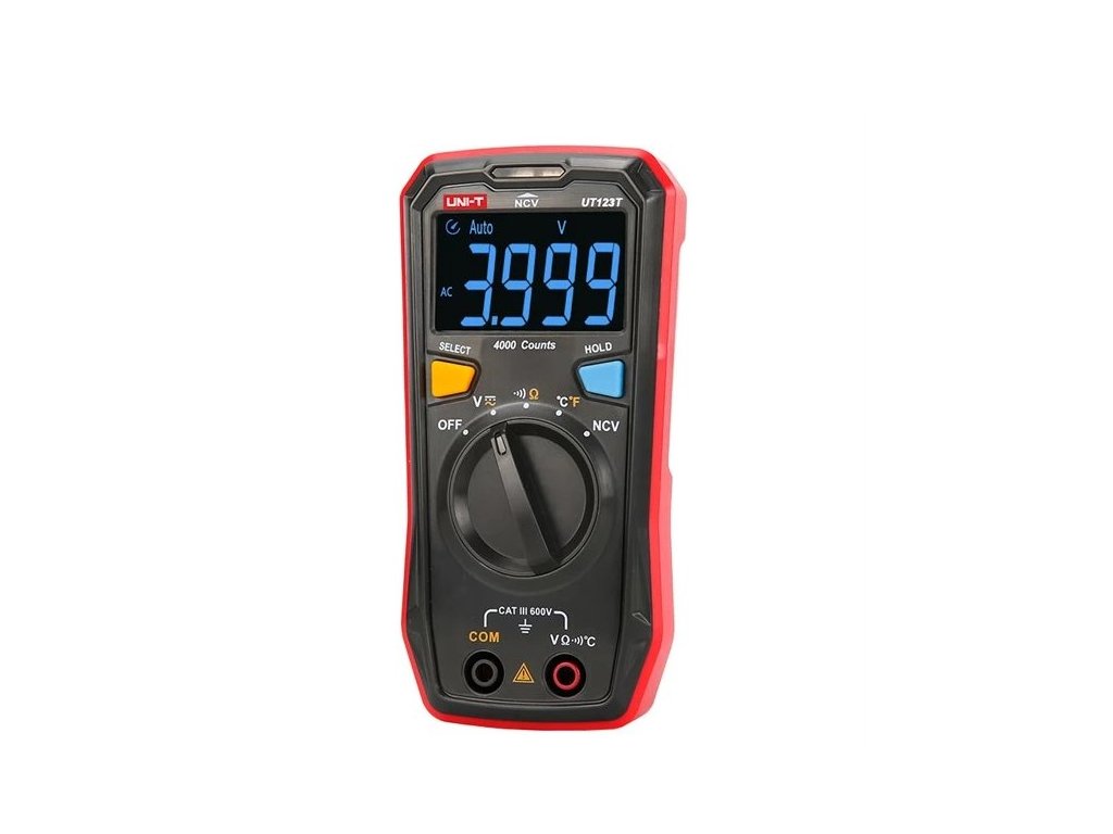 Multimeter UNI-T UT123T je jednoduchý kapesný prístroj na domáce použitie. Vďaka kompaktnej konštrukcii sa ľahko drží v jednej ruke a displej typu EBTN umožňuje používateľom získať čitateľné údaje pod maximálnym uhlom. Inteligentná bezkontaktná detekcia striedavého elektrického poľa, ktorá rozlišuje slabé, silné a veľmi silné elektrické polia. Parametre produktu: - meranie AC/DC napätia, odporu, teploty, indikacia prerušeného vedenia - indikácia elektromagnetického poľa okolo vodičov pod striedavým napätím - Automatická kontrola stavu batérie - Automatická identifikácia merania AC V/DC V. - Automatické prepínanie rozsahu pre meranie napätia a odporu - Automatické vypnutie po 1 č. / 4k? / 40k? / 400k? / 4M? / 20M? ±(0.8%+2) Meranie teploty: -40 °C až +300 °C / -40 °F až 572 °F NCV (bezkontaktná detekcia napätia) Indikácia prerušeného vedenia Typ displeja: EBTN Veľkosť displeja: 44 x 26 mm Maximálna hodnota zobrazenia: 4099 Vzor 2xAAA batéria 1,5 V Meranie podľa normy CAT III 600V Rozmery: 130 x 65 x 28 mm Hmotnosť: 130 g Obsah balenia: - 1 pár testovacích káblov - termočlánok 1ks - batéria AAA 1,5 V 2ks Max. Napätie striedavého prúdu: 600 V Max. Napätie jednosmerného prúdu: Max: 600 V Max. 600 600 Striedavý preud: Max: 0 A Max. Jednosmerný preud: Max: 0 A Merané veličiny: Striedavé napätie, jednosmerné napätie, odpor, teplota Špeciálne funkcie: Automatický rozsah, Podržanie údajov, Podsvietenie displeja, Režim spánku, Akustický test Rozlíšenie multimetra: 4000Dodatočné parametre