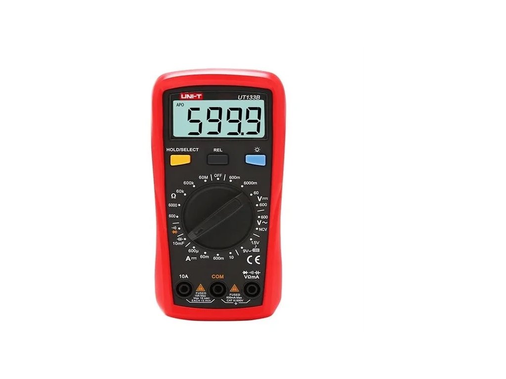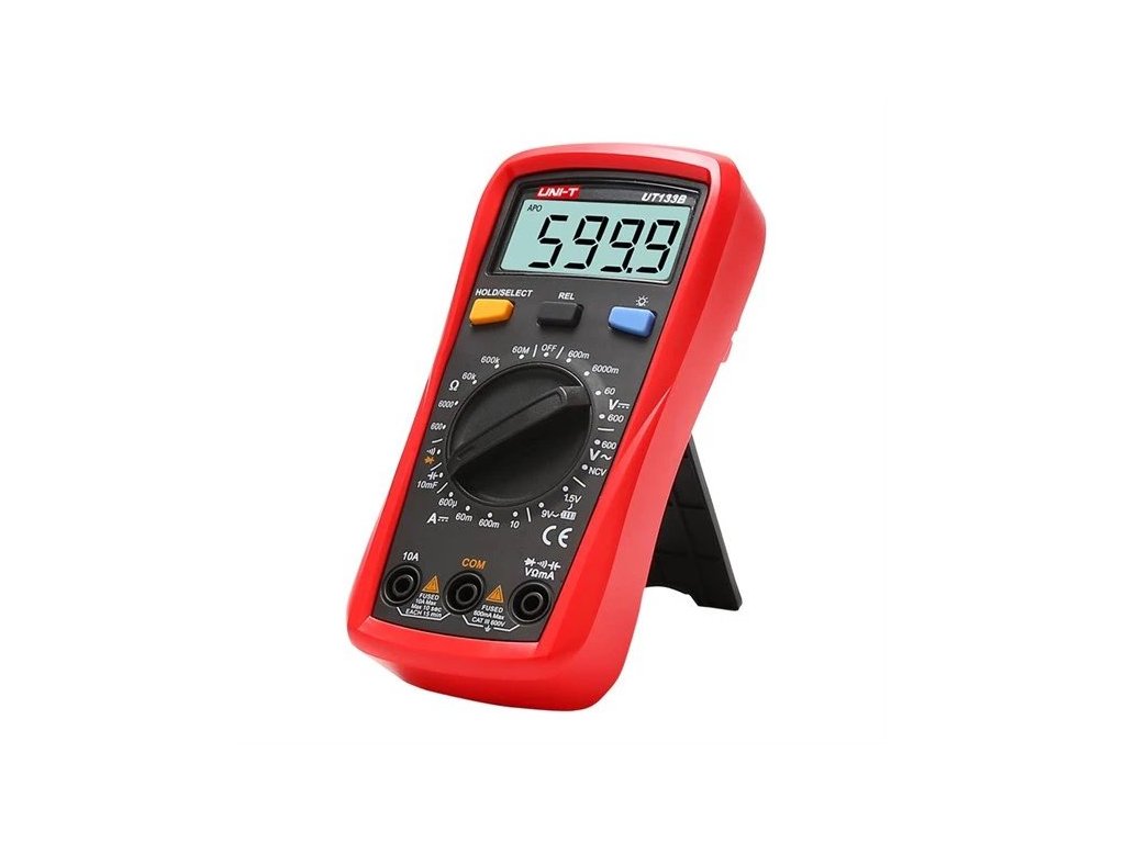UT133B s meraním kapacity kondenzátora a NCV. Nová generácia multimetrov série UT133 ponúka vyšší štandard merania v cenovo dostupnejšej kategórii digitálnych multimetrov. Inovatívny a priemyselný design zabezpečuje odolnosť multimetra voči nárazom a pádom z výšky až dvoch metrov. Nové usporiadanie LCD displeja je prehľadnejšie a praktickejšie pre všetkých užívateľov, navyše má displej možnosť podsvietenia. Funkcia multimetra: Meranie striedavého napätia (AC) - 600 V Meranie jednosmerného napätia (DC) - 600 mV / 600 V Meranie jednosmerného prúdu (DC) - 600 µA / 10 A Meranie odporu - 600 ? / 60 M? Meranie kapacity kondenzátora - 9,999 nF / 9,999 mF Test spojitosti vedenia (bzučiak) Test diód Test batérie Meranie NCV Detekcia opačnej polarity Funkcia podržania údajov Podsvietený displej Automatické vypnutie pri nečinnosti Meracie káble sú súčasťou dodávky striedavého napätia (rozsah, rozlíšenie, presnosť): 600,0 V / 0,1 V / ± (1,2 %+3) V/1 mV // ± (0,5 %+2) 60,00 V / 0,01 V / ± (0,7 %+3) 600,0 V / 0,1 V / ± (0,7 %+3) Meranie jednosmerného prúdu (rozsah, rozlišovanie, presnosť) : 600,0 ±A 60,00 mA / 0,01 mA / ± (1,0 % +3) 600,0 mA / 0,1 mA / ± (1,0 % +3) 10,00 A / 0,01 A / ± (1,2 % +5) Meranie odporu (rozsah, rozlíšenie, presnosť) / 0.1 ? / ± (1.0 %+2) 6.000k ?/6000 ? // 0.1k ?/ 1? // ± (0.8 %+2) 60.00 k? / 0.01 k? / ± (0.8 % +2) 600.0 k? / 0.1 k? / ± (0.8 % +2) 60.00 M? / 0.01 M? / ± (2 %+5) Meranie kapacity kondenzátora (rozsah, rozlišovanie, presnosť) : 9,999 nF / 0,001 nF / v režime REL ± (4 %+10) 99,99 nF / 0,01 nF / ± (4 %+5) 999 %+5) 9,999 µF / 0,001 µF / ± (4 %+5) 99,99 µF / 0,01 µF / ± (4 %5) 999,9 µF / 0,1 µF / ± (4 %+5) 9,999 µF / 0,0 76,5 x 155 x 49 Napájanie: 2 x AAA 1,5 V batérie (sú súčasťou dodávky) Hmotnosť : približne 255 g (včítane baterií) Prevádzková teplota : 0 - 40 °C Štandardné príslušenstvo : návod, meracie hrotyDodatočné parametre