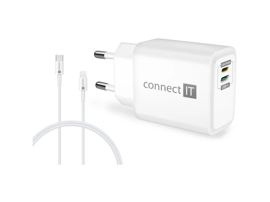 Nabíjací adaptér CONNECT IT DUPLEX 1xLightning + 1×USB-C, 20W, kábel 27W, BIELY