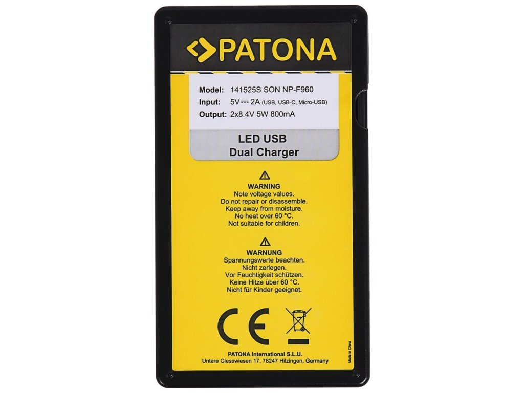 S nabíjačkou Patona DUAL môžete nabíjať 2 batérie súčasne bez ohledu na to, či majú obe batérie rovnakú kapacitu. Nabíjačky sú vyrobené podľa najvyšších európskych noriem kvality a vyznačujú sa extrémne dlhou životnosťou. Nabíjačku možno napájať cez konektor USB typu C, port micro USB alebo cez integrovaný kábel USB. ZÁKLADNÉ ŠPECIFIKÁCIE Vstupné napätie: DC 5 V / 2 A Výstupné napätie: 2x 8,4 V / 800 mA Kompatibilný so zariadeniami Sony NP-F960, NP-F970, NP-FM500, NP-FM500, BC-V615, DCM-M1, DCR-TRU47E, PLM-100, VCL-ES06A Kompatibilný s: Sony DCR-DVD100, DCR-DVD200, DCR DCR-PC101, DCR-PC105, DCR-PC110, DCR-PC115, DCR-PC120BT, DCR-PC330, DCR-PC9, DCR-PC9E Sony DCR-TRV10, DCR-TRV11, DCR-TRV140, DCR-TRV17, DCR-PC DCR-TRV20, DCR-TRV22, DCR-TRV22K, DCR-TRV230, DCR-TRV240, DCR-TRV245, DCR-TRV25, DCR-TRV250, DCR-TRV27, DCR-TRV30, DCR-TRV33, DCR-TRV30 DCR-TRV340, DCR-TRV350, DCR-TRV38, DCR-TRV39, DCR-TRV8, DCR-TRV8, DCR-TRV8, DCR-TRV8, DCR-TRV8, DCR-TRV8, DCR-TRV950 DSC-F707, DSC-F717 Sony DSC-S30, DSC-S50, DSC-S70, DSC-S75, DSC-S85 Sony MVC-CD200, MVC-CD250, MVC-CD300, MVC-CD350, MVC-CD4 CCD-TR200, CCD TR215, CCD TR300, CCD TR300, CCD TR3000, CCD TR3300, CCD TR416, CCD TR500, CCD TR516, CCD TR517, CCD TR57, CCD TR758, CCD TR77, CCD TR716 CCD-TR910, CCD-TR917, CCD-TR930, CCD-TR940, CCD-TR940, CCD-TRV119, CCD-TRV15, CCD-TRV16, CCD-TRV26, CCD-TRV25, CCD-TRV3000, CCD-TRV315 CCD-TRV4, CCD-TRV41, CCD-TRV43, CCD-TRV46, CCD-TRV51, CCD-TRV57, CCD-TRV57, CCD-TRV68, CCD-TRV67, CCD-TRV67, CCD-TRV67, CCD-TRV67 CCD-TRV72, CCD-TRV720, CCD-TRV75, CCD-TRV78, CCD-TRV98, CCD-TRV98, CCD-TRV93, CCD-TRV93 CCD-SC5, CCD-SC55, CCD-SC65 Sony DCR-TR7000 Sony DCR-TRV103, DCR-TRV110, DCR-TRV120, DCR-TRV130, DCR-TRV210, DCR-TRV310, DCR-TRV315, DCR-TRV320 DCR-TRV520, DCR-TRV525, DCR-TRV7, DCR-TRV720, DCR-TRV820, DCR-TRV9, DCR-TRV900, DCR-TV900, Sony DCR-VX1000, DCR-VX2000, DCR-VX2000 DCR-VX9 Sony DSC-CD100, DSC-CD250, DSC-CD400 Sony DSC-D700, DSC-D770 Sony DSR DSR-200, DSR-300, DSR-PD100 Sony GV-A500, GV-A500, GV-D200, GV-D200, MVC-FD200, MVC-FD5, MVC-FD51, MVC-FD7, MVC-FD71, MVC-FD73, MVC-FD85, MVC-FD88, MVC-FD88, MVC-FD88 MVC-FD91AOL, MVC-FD92, MVC-FD95, MVC-FD97, MVC-CD1000Dodatočné parametre