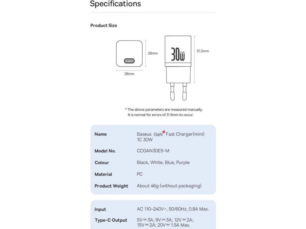 Mini nabíječka Baseus je vybavena technologií GaN a inteligentním řízením teploty, které usnadňují použití a poskytují ochranu vašim zařízením. Nechte nabíjet přes noc! Nabíječka Baseus nabízí výjimečný výkon, což ale neznamená, že nemůžete zabránit přebíjení! Je to ideální nabíječka, protože rozpoznává zbývající výkon připojených zařízení. Neváhejte a přidejte ji do košíku! Specifikace Materiál: polykarbonát Konektor: Type-C Výstupní proud: 5V, 9V, 12V, 15V, 20V Výkon nabíječky: 30W Výkon kabelu: 100W Délka kabelu: 1m Rozměry: 34 x 28 x 28mm Hmotnost: 41g Balení obsahuje: nabíječku, kabel Type-C Výrobce/Dovozce do EU: C.P.A. CZECH s.r.o., U Panasonicu 376, 53006 Pardubice - Staré Čívice, Česko, e-mail: cpa@cpa.cz, web: www.cpa.czDodatočné parametre