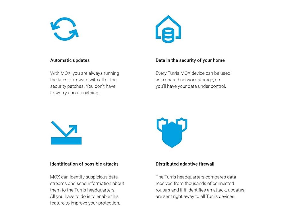 Adaptívny firewall: všetky bezpečnostné incidenty sa automaticky zdieľajú s ostatnými zariadeniami Turris po celom svete, firewall sa automaticky aktualizuje, aby poskytoval maximálnu bezpečnosť