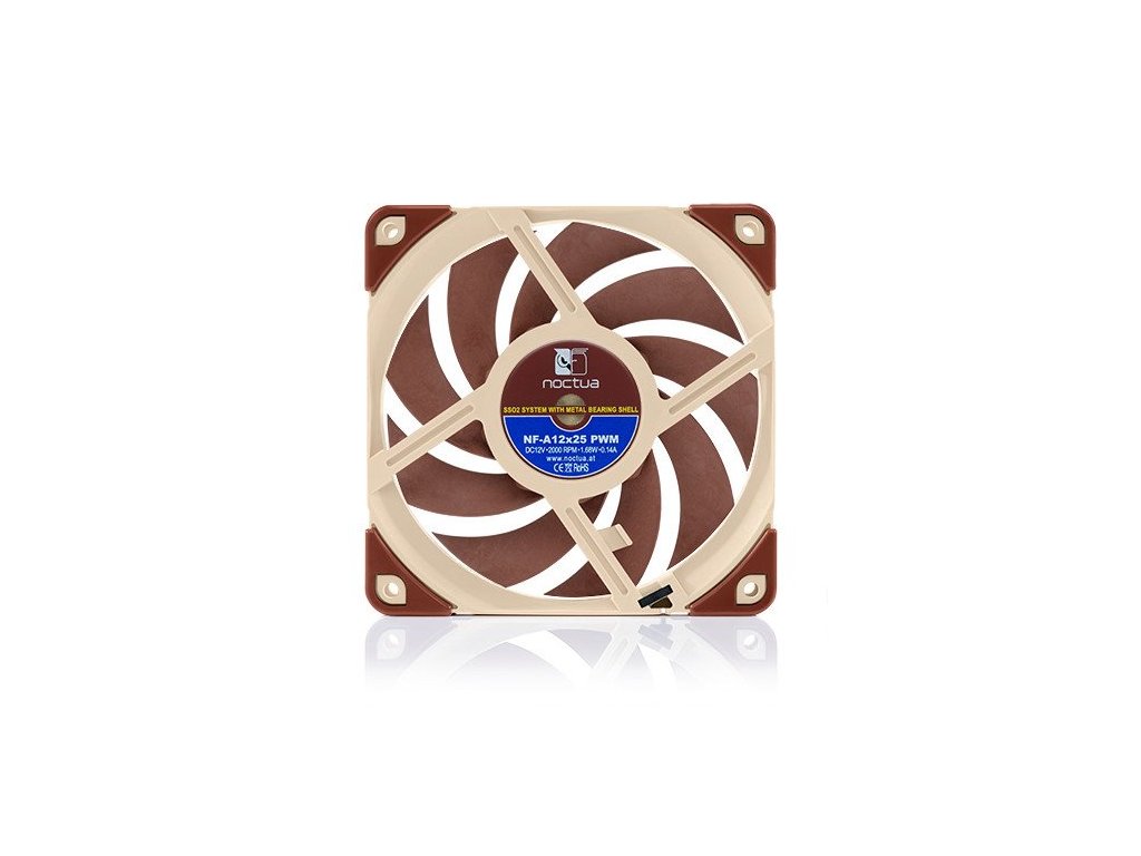 Nová generácia ventilátorov NF-A12x25 značky Noctua je next-gen na trhu. Rad NF-A12x25 je vyrobený zo špeciálneho nového materiálu Sterrox, ktorý umožňuje spojiť v jednom ventilátore vysoký statický tlak, vysoký prietok vzduchu a inštaláciu do skrine. To sú najdôležitejšie požiadavky na ventilátory. Nový materiál Sterrox je tvorený z polymérov tekutých kryštálov, ktoré majú veľmi vysokú pevnosť v ťahu a taktiež nízku tepelnú rozťažnosť. Pri rade ventilátorov NF-A12X25 je medzi vonkajším okrajom lopatky a rámčekom v najužšom mieste len 0,5 mm. Toto je minimálny priestor, a táto minimálna medzera je kľúčová na vytvorenie vysokého statického tlaku. Toto je ešte jedna výhoda tohto radu. Všetky tieto faktory ukazujú, že nový rad od Noctua je nová generácia ventilátorov, univerzálna a unikátna na trhu. NF-A12x25 PWM je verzia so štvorpinovým konektorom určená pre reguláciu otáčok (450–2000 RPM). Špecifikácia vetráčika: * Veľkosť: 120x120x25 mm * Vzdialenosť otvorov pre upevnenie: 105x105 mm * Konektor: 4-pin PWM * Ložiská: SSO2 * Tvar lopatiek: A-Series with Flow Acceleration Channels * Technológia rámu: AAO (Advanced Maximálna rýchlosť otáčok (+/- 10%): 2000 RPM * Maximálna rýchlosť otáčok s LNA (+/- 10%): 1700 RPM * Minimálna rýchlosť otáčok (PWM, +/-20%): 450 RPM * Maximálny prietok vzduchu: 102,1 m3/h * Maximálna rýchlosť Maximálny akustický hluk: 22,6 dB(A) * Maximálny akustický hluk s LNA: 18,8 dB(A) * Statický tlak: 2,34 mm H2O * Statický tlak s LNA: 1,65 mm H2O * Príkon: 1,68 W * Rozsah napätia: 12 V * Napätie 150.000 h Obsah balenia: * adaptér nízkeho hluku (LNA) * 4-pinový Y-kábel * 30cm predlžovací kábel * NA-AV2 antivibračné úchyty * Tesnenie proti vibráciám pre vodné chladiče * skrutky na pripevnenie ventilátoraDodatočné parametre